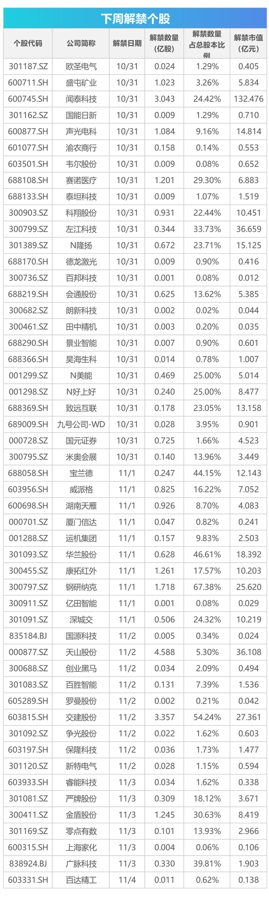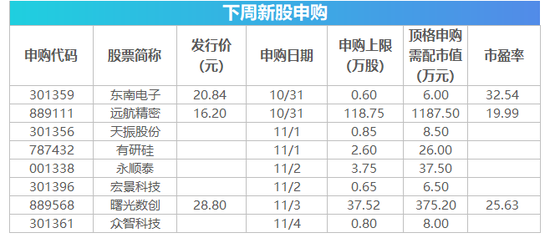 10月30日消息,下周影响市场的重要资讯有:10月PMI数据将公布;科创板股票做市交易业务将正式启动;新版《药品召回管理办法》施行;下周共有8只新股发行申购。 【重磅新闻】 10月PMI数据将公布 10月31日,国家统计局将公布10月中国制造业采购经理指数(PMI)。9月份,中国制造业PMI为50.1%,较上月上升0.7个百分点,在连续2个月运行在50%以下后重回扩张区间,显示经济走势稳中向好。 科创板股票做市交易业务将正式启动 经中国证监会批准,首批科创板做市商将于10月31日正式开展科创板股票做市交易业务。 新版《药品召回管理办法》施行 10月26日,国家药监局发布新修订《药品召回管理办法》,自11月1日起施行。新版《办法》明确持有人是控制风险和消除隐患的责任主体,药品生产企业、药品经营企业、药品使用单位应当积极协助,对于中药饮片、中药配方颗粒的召回,其生产企业按照新版《办法》组织实施。新版《办法》完善了持有人对可能存在质量问题或者其他安全隐患药品的调查评估要求,细化了持有人主动召回实施程序,督促和指导持有人对存在质量问题或者其他安全隐患药品及时主动召回,切实履行药品全生命周期管理义务。 美联储议息会议临近 11月3日,美联储将公布利率决议。据CME“美联储观察”,美联储11月加息50个基点至3.50%-3.75%区间的概率为3.7%,加息75个基点的概率为96.3%,加息100个基点的概率为0%。 下周445亿市值限售股解禁 Wind数据统计显示,下周(10月31日-11月4日)共有51家公司限售股陆续解禁,按10月28日收盘价计算,解禁市值为445.37亿元。 从解禁市值来看,按10月28日收盘价计算,解禁市值居前三位的是:闻泰科技(43.530, -2.85, -6.14%)(132.48亿元)、左江科技(106.490, 1.82, 1.74%)(36.66亿元)、天山股份(7.870, -0.51, -6.09%)(36.11亿元)。从个股的解禁量看,解禁股数居前三位的是:天山股份(4.59亿股)、交建股份(8.150, -0.24, -2.86%)(3.36亿股)、闻泰科技(3.04亿股)。 ![]() 【新股机会】 Wind数据统计显示,下周(10月31日至11月4日)将有8只新股发行,其中创业板有4只。10月31日发行的是远航精密、东南电子;11月1日发行的是有研硅、天振股份;11月2日发行的是宏景科技、永顺泰;11月3日发行的是曙光数创;11月4日发行的是众智科技。此外,下周将有4只新股首发上市,10月31日上市的是天纺标、隆扬电子、美能能源、好上好。 ![]()