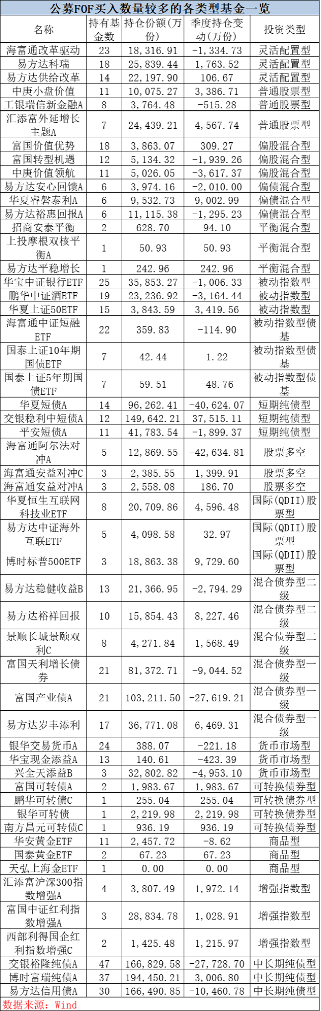 中国基金报记者 陆慧婧 随着三季报全部披露完毕,有着“专业买手”之称的公募FOF最新持仓也随之出炉。 Wind数据统计显示,海富通改革驱动、易方达科瑞、富国价值优势三只基金是全市场公募FOF三季度持有只数最多的权益基金,相比二季度,易方达科瑞取代中庚价值领航,新进FOF“最爱”权益基金前三名。 从调仓变动上看,部分公募FOF开始超配价值风格,煤炭、国防军工等相关基金在三季度获公募FOF较大力度增持。 谈及后市,多位FOF基金经理认为,当前A股估值处于较低水平,市场有望呈现短期震荡中期向上的格局。同时,部分基金经理也在密切关注美债、黄金等反脆弱性资产的投资机会。 海富通改革驱动、易方达科瑞、富国价值优势 成公募FOF基金“团宠” 随着公募基金旗下三季报披露完毕,FOF基金经理新一季基金配置清单也重磅出炉。 ![]() 具体来看,汇添富聚焦经典一年持有、国泰君安君得益三个月持有、中信证券财富优选等基金在三季度均重点配置海富通改革驱动基金,其中更有包括汇添富养老2040、海富通平衡养老目标、广发锐意进取等7只基金将海富通改革驱动作为前三大重仓基金。 不过,从持仓数量上看,三季度末公募FOF合计持有海富通改革驱动基金份额1.83亿份,相比二季度减持了1334.73万份,持有海富通改革驱动的FOF基金数量也相比二季度下降了1只。 据相关资料介绍,海富通改革驱动基金成立于2016年4月28日,基金经理周雪军过往长期以均衡投资风格著称,截止今年三季度末,成立以来收益率达到226.68%,过去三年收益133.50%,业绩也排名同类基金前四分之一水平。 易方达科瑞则在三季度取代中庚价值领航,新进公募FOF买入只数榜前三。Wind数据显示,共有18只公募FOF三季度重仓持有易方达科瑞,合计持有份额2.58亿份,相比二季度持有的FOF基金只数增加了6只,环比增持了1763.52万份。据悉,易方达科瑞基金经理杨嘉文是逆向投资选手,他擅长逆势投资,关注估值被错杀的个股,对于基本面坚固或出现好转信号的公司敢于重仓买入,分享估值修复带来的收益。 富国价值优势也是公募FOF“买基”榜单的常客,富国价值优势是一只运用“基本面增强”策略做沪深300增强的基金,wind数据显示,三季度末也有18只公募FOF重仓买入富国价值优势,尽管持有的FOF数量相比上一季度下降了两只,但合计持仓份额增长了309.26万份,三季度末持仓份额达到,863.07万份。 相比起重点持仓基金,增持榜单更能反映出FOF基金经理对后市的看法。据Wind数据统计,被动指数基金增持前三“花落”国泰中证军工ETF、富国中证军工龙头ETF、华夏中证新能源汽车ETF;灵活配置混合基金中,易方达积极成长、汇添富盈鑫、易方达裕如位列公募FOF增持份额前三;偏股混合基金增持前三则被易方达远见成长、易方达国防军工、易方达改革红利占据;股票基金增持前三分别为汇添富中国高端制造、中欧医疗创新、汇添富外延增长主题;平衡基金增持前三则是易方达平稳增长、招商安泰平衡、上投摩根双核平衡;偏债混合基金增持前三依次为华夏睿磐泰利、易方达丰惠、易方达安盈回报。尽管其中部分基金是被自家内部FOF买入,但也可以在一定程度上反映公募FOF的持仓变化。 三季度权益仓位偏向价值风格 增配煤炭、军工等行业配置比例 三季度A股大幅震荡,绩优FOF三季度的投资操作也是业内关注的重点,从三季度披露的情况上看,部分FOF基金经理将权益仓位偏向价值风格,也有部分FOF基金经理在三季度末进行了加仓。 兴全安泰平衡养老FOF基金经理林国怀在三季报中表示,本季度权益部分主要采取了以下操作:1、进行再平衡操作,将基金仓位下调到中枢附近;2、根据既定的策略参与股票定增、大宗交易等投资机会并参与相关的策略型基金,减持解禁的股票和“封转开”的基金。 组合风格上,目前权益部分相对略超配价值风格:经过 2019-2021 年成长风格持续占优的趋势行情后,市场对于“成长性”给予了较高的溢价,所以风格上适当的欠配成长、超配价值,尤其是以高股息为主要特征的红利类指数基金;此外,过去几年市场对于估值、下行风险等角度在意程度不足,所以在组合中也适当的超配了偏绝对思路的权益型基金以及注重性价比的 GARP 型基金品种;最后,继续保持对于投向海外市场的 QDII 基金和另类资产(主要是黄金 ETF)的适度配置。 从三季度持仓上看,易方达信用债、富国中证红利指数增强两只基金新进兴全安泰前十大重仓基金。 “站在二季度末,我们认为在外需逐步弱化、内需主要靠基建拉动的环境下,难以支撑股市持续上行,后续或将转向震荡,组合整体保持中性仓位。之后随着国内地产问题的持续演绎,海外货币政策转向鹰派,我们认为市场风险因素在积聚,避险情绪将再度提升,在 8 月小幅反弹后,组合进行了一定的仓位下调以应对后续可能的风险释放。而随着市场调整,权益资产的相对性价比不断提升,组合之前的风险规避也为后续加仓留有一定风险剩余,因此,在近期市场大幅调整过程中,组合再次提升仓位。整体来看,组合在季度内进行了一定幅度的仓位调整,主要是基于市场潜在风险及各类资产的风险补偿进行风险管理。”易方达如意安和FOF回顾三季度操作时表示。 易方达如意安和FOF同时称,在基金选择方面,主要是增加了具有周期研究背景、选股能力较强的基金经理管理的产品。债券方面,