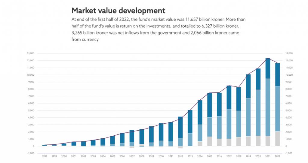 挪威央行投资管理公司截至 2022 年上半年底,基金价值的一半来自于投资回报。也就是说及基金设立以来,共赚了 63270 亿挪威克朗,剩余的 32650 亿挪威克朗来自于挪威政府注资,20660 亿挪威克朗来自于货币的汇率变化。