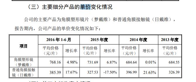 欧普康视 2021 年年报显示,公司角膜塑形镜的毛利率为 89.66%。其目前可查询到销售单价还要追溯到 2016 年 1-6 月,产品 " 梦戴维 " 的销售单价为 768.16 元。