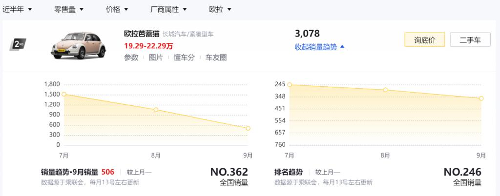 眼下,欧拉好猫虽然月销也有七千多辆,但终究独木难支;神似甲壳虫而且女人味十足的新车芭蕾猫,开启交付两个多月,月均只有一千多辆。