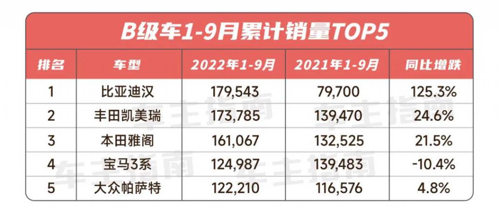 曾几何时,二十万以上的轿车市场,一度成为了自主品牌的 " 禁地 ",但是比亚迪可不管那么多。作为一台尺寸几乎对标中大型轿车的车型,比亚迪汉在 9 月份交出了 31336 辆的销量成绩单,这个数字不仅已经超越了丰田凯美瑞、本田雅阁、大众迈腾、帕萨特等主流合资 B 级车车型,即便是放在整个轿车市场的维度上,都是能排得上号的。