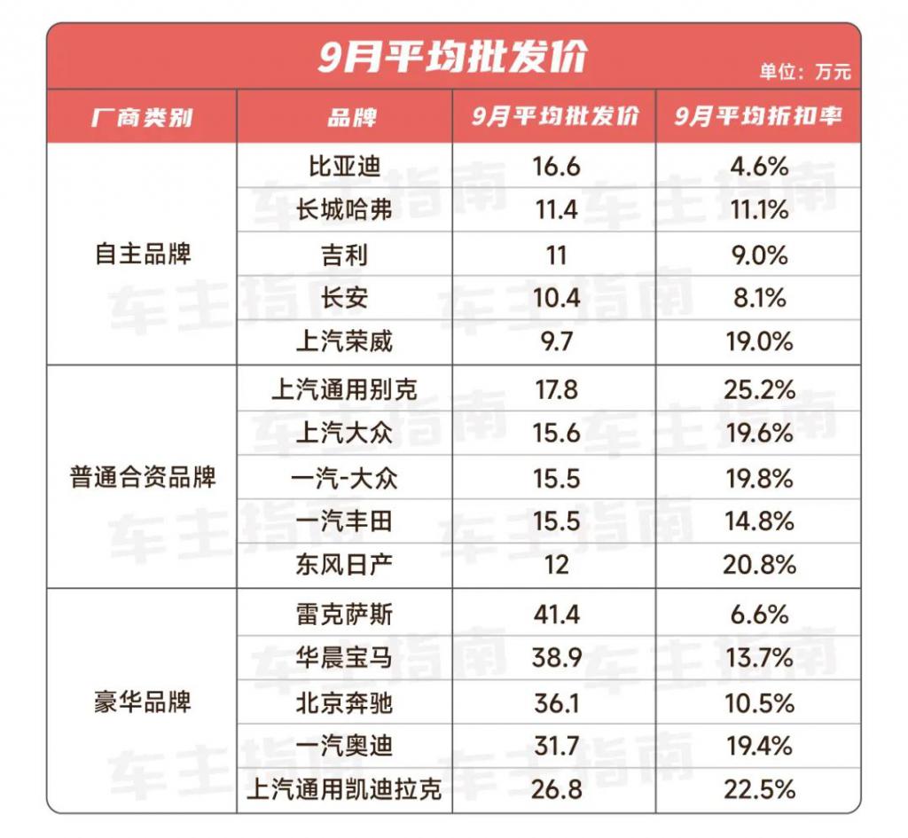 除了销量这种最表层的数据以外,还有一些更深层的东西我也想与大家分享一下。近日,有汽车数据平台发布了 9 月份车企平均批发价格数据,比亚迪以单车平均 16.6 万元的成交价,成为了传统非豪华品牌中的亚军,这个数字已经超越了 " 南北大众 " 以及丰田等一众以价格坚挺而闻名的合资车企了。如果不是上汽通用别克旗下有 GL8 这么一款高定价高销量的车型在支撑,比亚迪也许早就成为了非豪华品牌里成交价最高的品牌了。