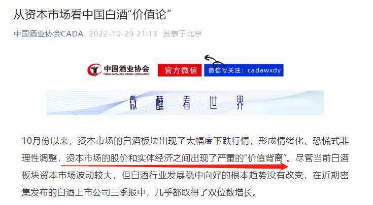 消费市场上1499元/瓶的飞天茅台依然难求,而低于1499元/股的贵州茅台(600519)已可轻松购入。 那么,上周,贵州茅台和白酒板块究竟怎么了?而伴随着白酒板块股价的下跌,贵州茅台和中国酒业协会连续多次发声,力挺白酒、驳“看空论”,为市场传递积极正向声音。 茅台:坚定信心 10月以来,A股多个板块白马股、权重股出现调整,贵州茅台、五粮液(000858)、中国平安(601318)、美的集团(000333)等各行业龙头均创下年内新低。 ![]() 作为白酒“一哥”,贵州茅台的一举一动都被各界重点关注,而茅台的不振也带动整个白酒板块走弱。 上周一盘中,“平价版”贵州茅台终于出现,股价一度跌破1499元,下探至1488.01元/股。最终,贵州茅台报收于1501.28元/股,股价全天跌幅达到7.58%,创下2020年7月以来的最大跌幅。时间往回看,进入10月之后,贵州茅台便迅速转入下跌通道,在最近的18个交易日中,有17个交易日股价下跌。 上周,贵州茅台连续跌破1600、1500元和1400元三大整数关口,股价从上周收盘时的1624元/股下跌至1360元/股,区间跌幅达到16.26%、累计成交725.6亿元。若时间轴再拉长看,10月10日至今,贵州茅台股价跌幅已达到27.37%,累计成交金额约1500亿元。不仅是贵州茅台,整个A股白酒板块均受影响,五粮液、山西汾酒(600809)、泸州老窖(000568)等知名品牌遭遇不同程度下挫。 面对逾7个点的跌幅,贵州茅台于10月24日晚间10点半发布官方公众号文章透露,当天茅台集团召开2022年第三十五次党委(扩大)会议,会议上强调,当前,新一年度的制酒生产开局良好,生产经营、市场运行等各项工作平稳有序,整体呈现稳中有进的良好发展态势,茅台有能力、有信心完成全年目标任务。 10月27日,贵州茅台再遇重挫,全天下跌4.31%,其股价最近一年多来再次进入1300元/股段位。 当日,茅台集团召开2023年度采购与供应链大会,全面盘点过去一年供应工作,系统安排来年目标任务。茅台集团党委书记丁雄军出席强调,要始终遵循“供以质胜、应为伙伴、链接现代”的茅台采供体系改革和供应链现代化建设总体思路,推动实现茅台供应链现代化。丁雄军强调,打造现代化产业生态圈,围绕“产业圈”,供应商要以茅台为中心,全力支持茅台和子公司发展,建立起一呼百应的宣传格局,共同保护茅台品牌、宣传茅台形象、维护茅台利益。 或许是向投资者回应股价走势情况,次日(28日),茅台集团迅速召开2022年第三十六次党委(扩大)会议。在会议上,贵州茅台强调,目前,茅台前三季度依然呈现逆势上扬、稳中求进的良好发展态势,各项指标始终保持两位数增长,市场端表现良好。同时,茅台也关注到资本市场端变化,茅台将坚定信心,保持定力,坚持推进高质量发展,为投资者带来良好的经济效益,为消费者提供高质量的美产品和美服务。 协会:严重“价值背离” 贵州茅台和白酒板块的股价“异动”,让白酒“看空论”四处弥散开来,而这也激起了中国酒业协会的出手。 10月29日晚间,中国酒业协会官方微信公众号发布文章《从资本市场看中国白酒“价值论”》认为,10月份以来,资本市场的白酒板块出现了大幅度下跌行情,形成情绪化、恐慌式非理性调整,资本市场的股价和实体经济之间出现了严重的“价值背离”。 ![]() 中国酒业协会指出,尽管当前白酒板块资本市场波动较大,但白酒行业发展稳中向好的根本趋势没有改变,在近期密集发布的白酒上市公司三季报中,几乎都取得了双位数增长。 今年1-8月,规上白酒企业累计完成销售收入4238.89亿元,同比增长15.22%;累计实现利润1596.26亿元,同比增长39.67%。白酒产业继续呈现结构性繁荣,数据显示,白酒产量占全国饮料酒总产量的13.43%,营业收入占67.88%,利润占88.61%。 据贵州茅台三季报披露,2022年1~9月期间,上市公司实现营业收入871.6亿元,同比增长16.77%;净利润444亿元,同比增长19%。其中,第三季度公司实现净利润约146亿元,同比增长15.81%,相比今年第一、二季度同比增速有所下降。进一步看,贵州茅台系列酒销售增速超过茅台酒,本期贵州茅台销售茅台酒略增至约744亿元,系列酒达125.4亿元,比去年同期系列酒销售增长约三成。 此外,五粮液2022前三季业绩同样稳健增长,营收净利继续保持两位数增长,也是2020年疫情以来,唯一一家每个季度营收、净利润均保持两位数增长的白酒上市公司。今年1-9月期间,该上市公司实现营业收入557.80亿元,同比增长12.19%;实现净利润199.89亿元,同比增长15.36%。第三季度单季,五粮液营业收入145.57亿元,同比增长12.24%;实现净利润48.90亿元,同比增长18.50%。 ![]() (供图:唐强) 在二线品牌中,山西汾酒2022前三季度实现营业收入221.44亿元,同比增长28.32%,远超去年全年水平(2021年营收规模199.71亿元);净利润71.08亿元,同比增长45.7%,各项主要经营指标再创历史新高。复星旗下的舍得酒业(600702)再创新高,今年前三季度实现营业收入46.17亿元,同比增长28%;净利润12亿元,同比增长23.76%。其中,第三季度净利润3.65亿元,同比增长55.66%。 10月30日晚间,又有三家酒企披露三季报,经营业绩纷纷飘红。 2022前三季度,古井贡酒(000596)实现营业收入127.65亿元,同比增长26.35%;净利润26.23亿元,同比增长33.2%。酒鬼酒(000799)前三季营收达到34.86亿元,同比增长32.05%;实现净利润9.72亿元,同比增长34.98%。 此外,水井坊也延续了此前的平稳增长,实现了较长周期的持续健康成长。今年前三季度,水井坊实现营业收入37.71亿元,同