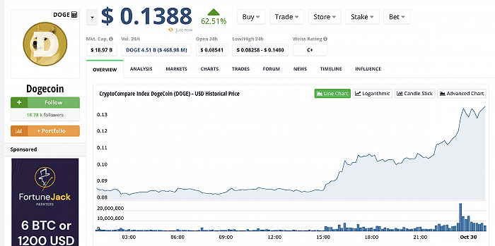 北京时间10月30日凌晨,加密货币网站CryptoCompare显示,Dogecoin(狗狗币)价格暴涨至每枚0.149美元,创近6个月价格新高,24小时内涨幅最大为62%。截至界面新闻记者发稿,狗狗币每枚0.1388美元,总市值达189.7亿美元。经过29日、30日的大涨,狗狗币已回温到了今年4月时的价格。 ![]() 狗狗币数据不断变动中 从回升的时间点来看,狗狗币价格于10月26日开始向上波动式爬坡,29日直线拉升。狗狗币价格的大幅增长,与Tesla(特斯拉)首席执行官ElonMusk(马斯克)成功收购Twitter(推特)有着直接的关系。据CNBC等媒体报道,当地时间10月27日,马斯克以440亿美元的价格,收购全球知名社交媒体推特。 ![]() 近一年来狗狗币价格走势 此前,推特支持用户向创作者打赏比特币和以太币,但未发行加密货币钱包产品。有业内人士表示,狗狗币的大涨,可能与市场猜测马斯克会在推特上开发加密钱包有关。 根据美国法院公开资料,马斯克曾在私人对话中提出关于区块链社交媒体的设想,其中提到用户通过付费的方式,将自己的消息写入区块链(比如花0.1狗狗币发布或转发评论),从而隔绝大多数垃圾邮件,保护言论自由。 软件工程师JacksonPalmer和BillyMarkus在2013年创立了狗狗币,主要运用的技术取自于比特币的币源代码,初衷为了嘲讽加密货币的投机性质,发行时仅为0.00026美元/枚。 ![]() 据CoinMarketCap数据,2021年5月,狗狗币创下0.73美元/枚的历史最高价格,至此累计涨幅2807倍。自2022年5月以来,受加密货币整体环境影响,狗狗币一直保持在0.09美元以下价位。 值得一提的是,由于名字是Dogecoin和ElonMusk的组合,一款名为DogelonMars的代币也随之水涨船高,每枚代币价格为0.0000004796美元,24小时内涨幅超57%,市值2.49亿美元,过去24小时内交易量为6300万美元。不过这一代币目前与马斯克还未显示有任何关联,且创始人未知,给投资带来了更大的不确定性,存在庞氏骗局的风险。 在市场看来,马斯克与狗狗币的“绑定”关系十分紧密。2019年,马斯克入局购买大量狗狗币。他曾多次公开称赞这一代币的发展前景,并表示“不会也不想减持手中的狗狗币”。 在马斯克与推特收购的几次推拉之中,狗狗币的价格也如过山车般高低起伏。 例如,今年4月,马斯克在表达对收购推特的想法时,提及建议将狗狗币作为推特订阅服务Blue的支付方式,狗狗币价格立时飙升。当他首次试图退出推特交易时,狗狗币在6月份则经历了被大规模抛售。 世界首富的影响力确实为狗狗币带来了投资者的目光,有很多投资者因为马斯克的“站台”而买入这一加密货币,却在5月份的大跌中损失惨重。马斯克也因此被投资者起诉。 6月,一名投资者起诉马斯克及旗下的SpaceX和特斯拉,要求赔偿2580亿美元,认为“马斯克利用他作为世界首富的地位来炒作和操纵狗狗币传销,以获取利润、曝光度和取乐。”9月份诉讼又新增7名投资者原告和6名被告。 2022年二季度财报显示,特斯拉出售了所持有近75%的比特币,套现9.36亿美元。在随后举行的电话会议中,马斯克表示,特斯拉没有出售狗狗币,抛售所持比特币是为了改善现金头寸,对未来增持比特币持开放态度。但特斯拉并没有透露其狗狗币持有量。 |