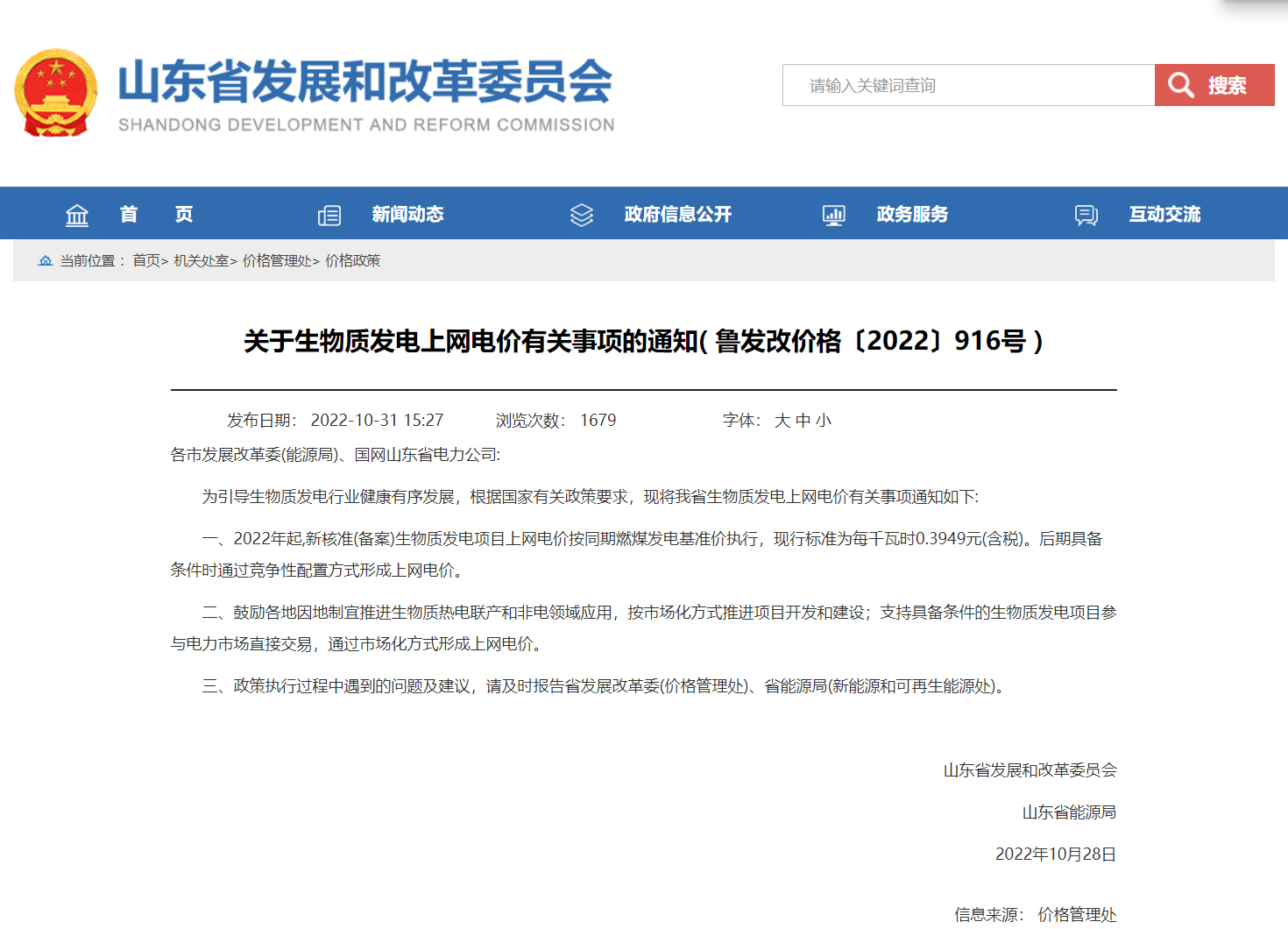 各市发展改革委(能源局)、国网山东省电力公司: 为引导生物质发电行业健康有序发展,根据国家有关政策要求,现将我省生物质发电上网电价有关事项通知如下: 一、2022年起,新核准(备案)生物质发电项目上网电价按同期燃煤发电基准价执行,现行标准为每千瓦时0.3949元(含税)。后期具备条件时通过竞争性配置方式形成上网电价。 二、鼓励各地因地制宜推进生物质热电联产和非电领域应用,按市场化方式推进项目开发和建设;支持具备条件的生物质发电项目参与电力市场直接交易,通过市场化方式形成上网电价。 三、政策执行过程中遇到的问题及建议,请及时报告省发展改革委(价格管理处)、省能源局(新能源和可再生能源处)。