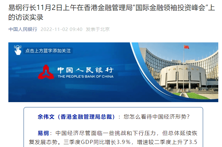 11月2日,央行官方微信刊发了央行行长易纲2日上午在香港金融管理局“国际金融领袖投资峰会”上的访谈实录。在本次访谈中,易纲就中国经济形势、人民币汇率走势、制度型开放、房地产市场等热点话题一一回应。 ![]() 同日,易纲和银保监会主席郭树清在《党的二十大报告辅导读本》中发表的文章陆续公布,也谈及了相关金融监管政策。 “国际金融领袖投资峰会”上 易纲回应多个热点话题 余伟文(香港金融管理局总裁):您怎么看待中国经济形势? 易纲:中国经济尽管面临一些挑战和下行压力,但总体延续恢复发展态势。三季度GDP同比增长3.9%,增速较二季度上升了3.5个百分点,充分显示出中国经济的韧性。就业形势稳定,9月份调查失业率5.5%。得益于粮食丰收、煤炭和电力供应稳定,通胀保持在较低水平,9月CPI同比增长2.8%,PPI同比增长0.9%。 余伟文:疫情对全球经济增长有深刻的影响,在这一背景下,您如何看待中国经济的增长潜力? 易纲:中国经济的潜在增长率将保持在合理区间。中国拥有超大规模市场,城镇化率仍有较大提升空间,中等收入阶层消费需求稳步增长。中国拥有世界上最大的工程师和技工队伍,已建成门类齐全的现代工业体系和高质量的基础设施网络。中国科技创新蓬勃发展,供给侧结构性改革不断深化,将持续增强经济增长动能。 余伟文:今年以来,面临多种挑战,中国的货币政策如何支持经济稳定增长? 易纲:中国坚持实施稳健的货币政策,加大对实体经济的支持力度。今年以来,我们保持流动性合理充裕,推动降低社会融资成本。9月末,广义货币M2同比增长超过12%,社会融资规模和人民币贷款余额同比增速分别在10.5%和11%左右。目前,市场利率稳中有降,金融市场资源配置效率较高。同时,我们通过结构性货币政策工具,加大对普惠小微、乡村振兴、绿色发展等重点领域和薄弱环节的支持力度。我们还致力于支持设备更新改造和基础设施投资,四季度效果会有所显现。 余伟文:您如何看待人民币汇率走势? 易纲:我们实行以市场供求为基础、参考一篮子货币进行调节、有管理的浮动汇率制度。今年以来,得益于中国经济长期向好的基本面,以及我们近年来坚持实施常态化货币政策,人民币对一篮子货币相对稳定,对美元有所贬值,但对其他主要货币有所升值。未来,我们将坚持市场在汇率形成中的决定性作用。人民币汇率将继续在合理均衡水平上保持基本稳定,人民币币值和购买力将保持稳定。 余伟文:在您看来,金融业如何实现二十大报告中提出的“制度型开放”? 易纲:我们将持续推进改革开放,稳步扩大金融领域规则、规制、管理、标准等制度型开放,积极参与国际金融合作与治理。我们将进一步完善准入前国民待遇加负面清单的管理制度,着力营造市场化、法治化、国际化一流营商环境,加强产权尤其是知识产权保护,提升金融市场投资信心。 余伟文:大家还非常关心中国房地产的发展,人民银行采取了哪些积极措施?前景如何? 易纲:房地产行业关联很多上下游行业。房地产市场区域特征明显且差异很大,各城市政府在稳定当地房地产市场中发挥着重要作用。人民银行积极支持房地产行业健康发展,降低了个人住房贷款利率和首付比例,鼓励银行通过“保交楼”专项借款支持已售住房建设交付,支持刚性和改善性住房需求。近期,房地产销售和贷款投放已有边际改善。随着中国城镇化进程不断推进,我们相信房地产市场能保持平稳健康发展。 余伟文:您如何看待香港的国际金融中心地位,以及香港在联系内地和全球市场中发挥的作用? 易纲:香港现在是未来仍将是重要的国际金融中心,是连接内地和国际市场的重要桥梁。这些年,香港经济和金融体系显示了强大的韧性。香港与内地在金融市场联通、“一带一路”投融资、金融科技和绿色金融等领域拥有巨大合作潜力。我们将全力支持香港的发展,支持香港建设和保持充满活力的营商环境,进一步加强国际金融中心建设。 易纲:管好货币总闸门 实施正常的货币政策 另据证券时报2日消息,人民银行行长易纲在《党的二十大报告辅导读本》中发表文章《建设现代中央银行制度》,易纲在文章中指出,建设现代中央银行制度,要完善货币政策体系,维护币值稳定和经济增长。高杠杆是宏观金融脆弱性的总根源,中央银行要管好货币总闸门。实施正常的货币政策,简单来说,是指主要通过利率的调整可以有效调节货币政策的情况。正常的货币政策不仅有利于促进居民储蓄和收入合理增长,也有利于提高人民币资产的全球竞争力。 易纲在文章中指出,当前,在加快构建新发展格局的背景下,需要进一步深化金融供给侧结构性改革,持续优化金融产品和金融服务,大力发展普惠金融、绿色金融、科技金融,推进构建多层次资本市场,健全资本市场功能,提高直接融资比重,加强金融基础设施建设。 易纲指出,落实金融机构及股东的主体责任,提升金融机构的稳健性。大规模的“他救”是特定历史时期的特殊安排。“自救”应成为当前和今后应对金融风险的主要方式。当前,我国社会主义市场经济体制已经全面确立,金融机构及股东作为市场主体,应当承担自主经营、自负盈亏、“自救”风险的主体责任。金融机构要建立市场化资本补充机制,按照监管规则计提拨备,加大不良资产处置力度,塑造金融机构健康的资产负