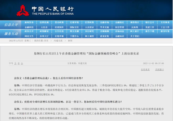 离岸人民币兑美元日内大涨超800点,一度升破7.25关口。在岸人民币兑美元日内大涨近600点,最高报7.2422。 今日,在岸、离岸人民币双双大涨。 截止发稿,离岸人民币兑美元日内大涨超800点,一度升破7.25关口,目前报7.2545,涨幅为1%。 在岸人民币兑美元日内大涨近600点,最高报7.2422。 11月3日,人民银行、外汇局召开学习贯彻党的二十大精神宣讲报告会。央行行长易纲表示,要完善货币政策体系,维护币值稳定,促进经济增长。 易纲表示,要完善货币政策体系,维护币值稳定,促进经济增长。增强人民币汇率弹性,保持人民币汇率在合理均衡水平上的基本稳定。深化金融改革,提升金融服务实体经济能力。加强和完善现代金融监管,强化金融稳定保障体系,为推动经济高质量发展和维护国家经济安全提供坚实有力保障。 易纲重磅发声!事关经济增长、货币政策、房地产、人民币汇率 11月2日上午,央行行长易纲在香港金融管理局“国际金融领袖投资峰会”上接受访谈。 易纲提到,中国经济总体延续恢复发展态势,将坚持实施稳健的货币政策,加大对实体经济的支持力度。他强调,人民币汇率将继续在合理均衡水平上保持基本稳定等。 ![]() 图源/央行网站截图 央行易纲最新发声!信息量巨大 易纲在峰会上与香港金管局总裁余伟文对谈表示,中国经济尽管面临一些挑战和下行压力,但总体延续恢复发展态势。 中国第三季度GDP同比增长3.9%,增速较第二季度上升了3.5个百分点。就业方面,9月调查失业率为5.5%,就业形势稳定。此外,通胀亦保持在较低水平,9月CPI同比增长2.8%,PPI同比增长0.9%,主要是得益于粮食丰收、煤炭和电力供应稳定。 谈经济形势:中国经济潜在增长率将保持在合理区间 易纲指出,中国经济的潜在增长率将保持在合理区间,“中国拥有超大规模市场,城镇化率仍有较大提升空间,中等收入阶层消费需求稳步增长。中国拥有世界上最大的工程师和技工队伍,已建成门类齐全的现代工业体系和高质量的基础设施网络。中国科技创新蓬勃发展,供给侧结构性改革不断深化,将持续增强经济增长动能。” 谈货币政策:坚持实施稳健的货币政策 货币政策方面,易纲表示中国坚持实施稳健的货币政策,加大对实体经济的支持力度。9月末,广义货币M2同比增长超过12%,社会融资规模和人民币贷款同比增速分别在10.5%和11%左右。 易纲指出,“我们通过结构性货币政策工具,加大对普惠小微、乡村振兴和绿色发展等领域的支持力度”,同时亦致力于支持设备更新改造和基础设施投资,“这些会在今年第四季度的数据中有所显现”。 谈人民币汇率:人民币币值和购买力将保持稳定 谈及人民币汇率走势,易纲表示:“我们将坚持市场在汇率形成中的决定性作用,人民币汇率将继续在合理均衡水平上保持基本稳定,人民币币值和购买力将保持稳定。” 谈房地产市场:相信能保持平稳健康发展 就市场关注的中国房地产市场,易纲指出,各城市政府在稳定当地房地产市场中发挥着重要作用。人民银行降低了个人住房贷款利率和首付比例,并鼓励银行通过“保交楼”专项借款支持已售住房的建设交付,支持刚性和改善性住房需求。 央行近期宣布,自2022年10月1日起,下调首套个人住房公积金贷款利率0.15个百分点,5年以下(含5年)和5年以上利率分别调整为2.6%和3.1%。 中国银行保险监督管理委员会副主席肖远企表示,内地房地产在经济中扮演重要角色。目前银行业数据显示,内房占整体借贷水平的26%,属于可接受水平,目前已经转稳。 此外,易纲指出,香港仍是重要的国际金融中心,是连接内地和国际市场的重要桥梁。香港与内地在金融市场的联通、“一带一路”投融资、金融科技和绿色金融等领域拥有巨大合作潜力。 易纲:“自救”应成为当前和今后应对金融风险的主要方式 人民银行行长易纲在《党的二十大报告辅导读本》中发表文章《建设现代中央银行制度》。 易纲指出,未来我国经济潜在增速有望维持在合理区间,要管好货币总闸门,实施正常的货币政策。完善以市场供求为基础、参考一篮子货币进行调节、有管理的浮动汇率制度。推进构建多层次资本市场,健全资本市场功能,提高直接融资比重。构建绿色金融“五大支柱” 分步建设强制性的信息披露制度。扩大金融业高水平开放,在多边债务重组中坚决维护我国海外债权利益。 未来我国经济潜在增速有望维持在合理区间 易纲在文章中指出,未来,我国经济潜在增速有望维持在合理区间,有条件尽量长时间保持正常的货币政策,保持正的利率,保持正常的、斜率向上的收益率曲线形态。 管好货币总闸门,实施正常的货币政策 易纲在文章中指出,建设现代中央银行制度,要完善货币政策体系,维护币值稳定和经济增长。 高杠杆是宏观金融脆弱性的总根源,中央银行要管好货币总闸门。实施正常的货币政策,简单来说,是指主要通过利率的调整可以有效调节货币政策的情况。正常的货币政策不仅有利于促进居民储蓄和收入合理增长,也有利于提高人民币资产的全球竞争力。 完善以市场供求为基础、参考一篮子货币进行调节、有管理的浮动汇率制度 易纲在文章中指出,健全货币政策调控机制。健全基础货币投放机制和货币供应调控机制,强化流动性、资本和利率约束的长效机制。发挥货币政策的总量和结构双重功能,精准加大对国民经济重点领域和薄