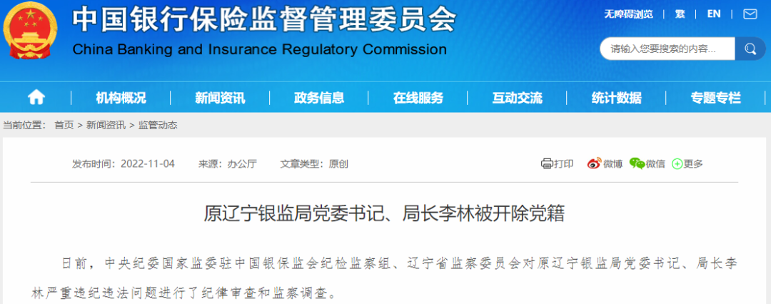 ![]() 银保监会网站11月4日消息显示,经中国银保监会党委会议研究决定,原辽宁银监局党委书记、局长李林已给予开除党籍处分,取消其享受的待遇,收缴其违法所得。同时,经辽宁省监委研究决定,将李林涉嫌犯罪问题移交检察机关依法审查起诉,所涉财物随案移送。 ![]() 甘为不法企业“马前卒”,充当违法高管“保护伞” 通报显示,经查,李林违反政治纪律,落实党中央金融工作决策部署阳奉阴违、滥权妄为,大肆为不法企业和金融机构谋取非法利益,严重破坏地方金融秩序,助推区域金融风险;落实管党治党政治责任不力,严重破坏单位政治生态;对抗组织审查,与他人串供。违反中央八项规定精神和廉洁纪律,收受可能影响公正执行公务的礼品和接受旅游安排,纵容亲属吃空饷。违反组织纪律,违规干预金融机构人事工作。违反工作纪律,违规插手干预行政许可和银行机构贷款发放。违反生活纪律,与他人发生不正当性关系;家风不正,对亲属失管失教。利用职务便利和职务影响为被监管对象谋取利益,在办理贷款、企业上市、设立和入股中小银行等方面为他人谋取利益,非法收受巨额财物,涉嫌受贿犯罪;利用监管职权,违规免除银行机构行政处罚,批准超比例持股银行机构,造成重大损失,涉嫌滥用职权犯罪;利用职务之便,隐瞒、掩盖银行高管人员违法犯罪行为,涉嫌徇私舞弊不移交刑事案件犯罪。 通报指出,李林身为金融监管部门的党员领导干部,理想信念丧失,党性原则荡然无存,价值观、权力观极度扭曲,罔顾党中央关于加强和改进金融监管、切实防范金融风险的决策部署,甘为不法企业“马前卒”,充当银行机构和银行高管人员违法违规行为的“保护伞”,是与不法私营企业主、金融“蠹虫”沆瀣一气、攫取私利的突出典型;长期担任“一把手”,全面弃守管党治党“第一责任”,带头破纪违法,恣意滥权妄为,甘于被“围猎”,贪腐渎职触目惊心;对亲属疏于管教乃至纵容,致使家人贪欲膨胀、毫无敬畏。 “李林违纪违法问题涉案金额大,时间跨度长,且在党的十八大乃至十九大后不收敛、不收手、不知止,严重违反党的纪律,构成严重职务违法并涉嫌受贿犯罪、滥用职权犯罪、徇私舞弊不移交刑事案件犯罪,性质严重、影响恶劣,应予严肃处理。”通报表示,根据《中国共产党纪律处分条例》《中华人民共和国监察法》《中华人民共和国公职人员政务处分法》等有关规定,经中国银保监会党委会议研究决定,给予李林开除党籍处分,取消其享受的待遇;收缴其违纪违法所得;经辽宁省监委研究决定,将李林涉嫌犯罪问题移交检察机关依法审查起诉,所涉财物随案移送。 人走“查”不凉,年内辽宁银保监系统已有5人被处理 公开资料显示,李林1960年10月出生,1983年8月参加工作,1992年2月加入中国共产党。2003年7月进入银保监系统,历任大连银监局筹备组组长,党委书记、局长;辽宁银监局党委委员、副局长;安徽银监局党委书记、局长(正局级);辽宁银监局党委书记、局长;大连银监局党委书记、局长;大连银保监局筹备组成员;大连银保监局巡视员、一级巡视员。2020年11月退休。 中央纪委国家监委网站2021年12月11日消息显示,李林涉嫌严重违纪违法,接受纪律审查和监察调查。 9月以来,辽宁银保监系统已有5名官员被处理: 9月1日,营口银保监分局原党委委员、副局长靳松被开除党籍和公职; 9月1日,辽阳银保监分局原党委书记、局长郑卫红被开除党籍和公职; 9月9日,营口监管分局党委书记、局长朱生辉接受纪律审查和监察调查; 9月9日,锦州监管分局原二级巡视员姜涛接受纪律审查和监察调查。 银保监会此前召开的党委(扩大)会议也明确指出,要坚决打赢反腐败斗争攻坚战持久战,坚持不敢腐、不能腐、不想腐一体推进,做好金融反腐与防控金融风险统筹衔接。要强化正风肃纪,锲而不舍落实中央八项规定精神。持续深化纠治“四风”,重点纠治形式主义、官僚主义,坚决破除特权思想和特权行为。 责编:汪云鹏