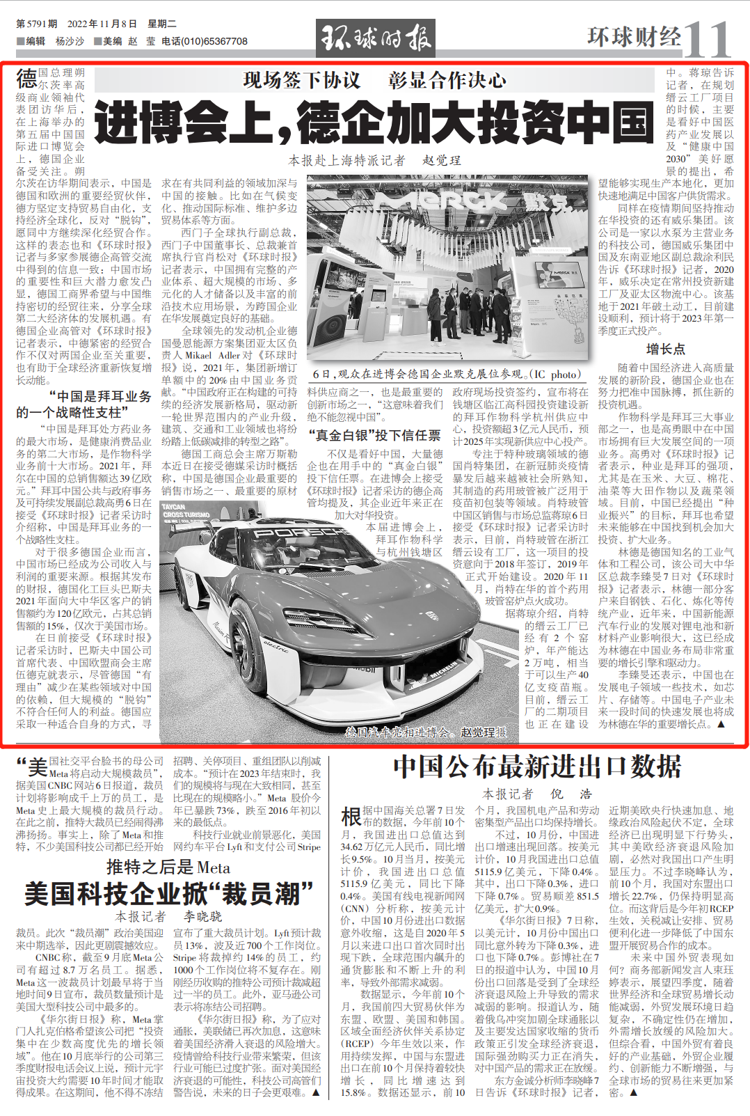 外媒:奔驰董事会主席称朔尔茨访华绝对正确,反对疏远中国 据路透社报道,德国汽车品牌梅赛德斯-奔驰董事会主席康林松当地时间7日在柏林的欧洲管理技术学院参加一场活动时表态,反对疏远中国,称那些“想放弃中国”的想法是不可思议的。 ![]() 报道称,就在几天前,德国总理朔尔茨率领一个商界领袖代表团访问中国。康林松7日在参加活动时称,他深信全球化的好处,而朔尔茨此次访华“绝对正确”。他还强调,“疏远中国是错误的方向”。 德国《明镜周刊》也报道了康林松的表态,并提到中国是世界最大的汽车市场,德国汽车行业对中国非常依赖。 德国总理朔尔茨11月4日开启其首次访华之旅。当天,朔尔茨在北京表示,中国是德国和欧洲的重要经贸伙伴,德方坚定支持贸易自由化,支持经济全球化,反对“脱钩”,愿同中方继续深化经贸合作,支持两国企业相互赴对方开展投资合作。 与朔尔茨随行的德方经济代表团也成为国际关注的焦点。据德国《商报》此前报道,100多家公司申请政府专机上令人羡慕的座位,最终12家获准,因为中国的商业从未像今天这样重要。在中德经贸关系出现一些杂音的当下,此次访问无疑传递出德国工商业对中国市场的重视。此次随朔尔茨访华的商界领袖来自多个行业,他们代表的企业每年在华营收高达数百亿欧元。相关专家对《环球时报》记者表示,这些具有代表性的德国高管随朔尔茨访问中国,证明任何想让中德经贸关系疏远的“离心力”都比不上中国经济发展带来的巨大吸引力。 番外 现场签下协议,彰显合作决心,德企进博会上加大投资中国! 德国总理朔尔茨率高级商业领袖代表团访华后,在上海举办的第五届中国国际进口博览会上,德国企业备受关注。朔尔茨在访华期间表示,中国是德国和欧洲的重要经贸伙伴,德方坚定支持贸易自由化,支持经济全球化,反对“脱钩”,愿同中方继续深化经贸合作。这样的表态也和《环球时报》记者与多家参展德企高管交流中得到的信息一致:中国市场的重要性和巨大潜力愈发凸显,德国工商界希望与中国维持密切的经贸往来,分享全球第二大经济体的发展机遇。有德国企业高管对《环球时报》记者表示,中德紧密的经贸合作不仅对两国企业至关重要,也有助于全球经济重新恢复增长动能。 ![]() 6日,观众在进博会德国企业默克展位参观。(IC photo) “中国是拜耳业务的一个战略性支柱” “中国是拜耳处方药业务的最大市场,是健康消费品业务的第二大市场,是作物科学业务前十大市场。2021年,拜尔在中国的总销售额达39亿欧元。”拜耳中国公共与政府事务及可持续发展副总裁高勇6日在接受《环球时报》记者采访时介绍称,中国是拜耳业务的一个战略性支柱。 ![]() 对于很多德国企业而言,中国市场已经成为公司收入与利润的重要来源。根据其发布的财报,德国化工巨头巴斯夫2021年面向大中华区客户的销售额约为120亿欧元,占其总销售额的15%,仅次于美国市场。 在日前接受《环球时报》记者采访时,巴斯夫中国公司首席代表、中国欧盟商会主席伍德克就表示,尽管德国“有理由”减少在某些领域对中国的依赖,但大规模的“脱钩”不符合任何人的利益。德国应采取一种适合自身的方式,寻求在有共同利益的领域加深与中国的接触。比如在气候变化、推动国际标准、维护多边贸易体系等方面。 西门子全球执行副总裁,西门子中国董事长、总裁兼首席执行官肖松对《环球时报》记者表示,中国拥有完整的产业体系、超大规模的市场、多元化的人才储备以及丰富的前沿技术应用场景,为跨国企业在华发展奠定良好的基础。 全球领先的发动机企业德国曼恩能源方案集团亚太区负责人Mikael Adler对《环球时报》说,2021年,集团新增订单额中的20%由中国业务贡献。“中国政府正在构建的可持续的经济发展新格局,驱动新一轮世界范围内的产业升级,建筑、交通和工业领域也将纷纷踏上低碳减排的转型之路”。 德国工商总会主席万斯勒本近日在接受德媒采访时概括称,中国是德国企业最重要的销售市场之一、最重要的原材料供应商之一,也是最重要的创新市场之一,“这意味着我们绝不能忽视中国”。 “真金白银”投下信任票 不仅是看好中国,大量德企也在用手中的“真金白银”投下信任票。在进博会上接受《环球时报》记者采访的德企高管均提及,其企业近年来正在加大对华投资。 本届进博会上,拜耳作物科学与杭州钱塘区政府现场投资签约,宣布将在钱塘区临江高科园投资建设新的拜耳作物科学杭州供应中心,投资额超3亿元人民币,预计2025年实现新供应中心投产。 专注于特种玻璃领域的德国肖特集团,在新冠肺炎疫情暴发后越来越被社会所熟知,其制造的药用玻管被广泛用于疫苗初包装等领域。肖特玻管中国区销售与市场总监蒋琼6日接受《环球时报》记者采访时表示,目前,肖特玻管在浙江缙云设有工厂,这一项目的投资意向于2018年签订,2019年正式开始建设。2020年11月,肖特在华的首个药用玻管窑炉点火成功。 据蒋琼介绍,肖特的缙云工厂已经有2个窑炉,年产能达2万吨,相当于可以生产40亿支疫苗瓶。目前,缙云工厂的二期项目也正在建设中。蒋琼告诉记者,在规划缙云工厂项目的时候,主要是看好中国医药(14.770, 0.07, 0.48%)产业发展以及“健康中国2030”美好愿景的提出,希望能够实现生产本地