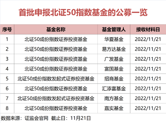来源:中国基金报 中国基金报记者 李树超 在北交所开市满一周年之际,11月21日,北证50成份指数(1028.720, 25.57, 2.55%)(简称“北证50”)正式发布实时行情,跟踪该指数的公募基金也来了。 当日,易方达、华夏、广发、富国、招商、汇添富、南方、嘉实等8家基金管理人纷纷申报“北证50成份指数证券投资基金”,证监会官网显示,上述产品的申报材料已接收。这也意味着,投资者低门槛参与北交所市场和把握“专精特新”中小企业投资机遇,将拥有高效便捷的投资工具,指数产品工具的推出也将为市场引入更多增量资金和多样化投资者。 ![]() “北证50成份指数基金”申报 8家基金管理人抢先 11月21日,“北证50”发布实时行情。上线首日,北证50以1024.07点高开2.09%。截至当日收盘,北证50报收1028.72点,当天涨幅2.55%。森萱医药(11.420, 1.02, 9.81%)、鹿得医疗(6.900, 0.52, 8.15%)等个股涨幅居前。 ![]() 同日下午,华夏、易方达、广发、富国、招商、汇添富、南方、嘉实等8家基金管理人纷纷申报“北证50成份指数证券投资基金”。证监会官网显示,上述产品的申报材料已接收,接收日期为11月21日。投资者布局北交所宽基指数,即将有便捷的公募投资工具。 ![]() 多位业内机构和人士表示,北交所指数基金产品的推出,标志着北交所产品体系建设的进一步完善,有利于丰富市场投资者的数量与结构,为市场带来更多长期资金,提升市场流动性水平,并促进市场平稳运行。 汇添富基金经理晏阳认为,北证50指数兼具表征性和投资性,未来随着指数建设有序推进,投资者类型逐步丰富,市场关注度日益提高,北交所市场流动性有望进一步改善,并推动北交所制度建设不断完善。 南方基金也认为,北证50成份指数的发布意义深远。该指数的发布有利于投资者对北交所的研究,指数也有望提升北交所的能见度,为产品设立提供更为客观的基准,有利于扩容北交所主题产品,未来北证50成份指数基金的设立可以期待,将为北交所带来更多增量资金。 嘉实基金也表示,正积极准备北交所指数化产品布局工作,以便能够为投资者提供一键直投北交所优质企业的新工具。 除了推出北证50指数外,近日中证指数、国证指数也分别发布公告,决定将北交所股票纳入中证、国证跨市场指数体系。 业内人士对此表示,全面纳入跨市场指数体系后,北交所将进入广泛的A股可投资空间,获得公募基金等机构资金的进一步增配。同时,指数作为投资业绩基准,有望对整个资产管理行业的配置产生更加深远的影响。 据悉,北交所开市运行一年以来,市场建设快速推进,规模体量持续壮大,集聚了一批细分创新领域的优质企业,吸引超520万户投资者入市,超580只公募基金参与市场,已成为资本市场重要的组成部分。 相对主动基金 指基具有低费率、透明等特点 据记者统计,目前,全市场已有10只北交所主题基金,分别是去年11月成立的8只基金和今年8月成立的2只基金。 与市场已有的北交所主动管理基金相比,北交所指数产品具有低费率、申赎灵活、持仓透明和风险分散化等方面的优势。 华夏基金数量投资部总监李俊分析,首先,目前已发的北交所主动管理基金,管理费率均在1.5%左右,而指数产品的管理费率一般在0.5%左右,指数产品的低费率能够提供更低的持有成本;其次,目前已发的北交所主动管理基金主要采用两年定开的方式,锁定期内投资者无法赎回,而指数产品申赎更加灵活;第三,相较于北交所主动管理基金,指数产品持仓更加透明;最后,相较于北交所主动管理基金,指数产品的持仓会相对更加分散,避免了单一个股风险对业绩的影响,具有分散非系统性风险的优势。 南方基金相关负责人也表示,与主动管理基金相比,指数基金具有指数编制方法公开、客观、透明的特点,主动管理基金与被动指数基金的投资目标、投资策略也各不相同。此外,指数基金的管理费等费率一般而言低于主动管理基金。 “预计北证50指数化产品的推出既能给个人和机构投资者提供重要的北交所配置工具,也会给北交所的整体交易活跃度的提升带来很大的帮助。”南方基金上述负责人也称。 北京一位公募人士表示,随着北证50推出,被动型产品加速布局。对投资者来说,可以通过指数化投资分散风险,降低成本,是分享创新型中小企业高速成长红利的新工具,为普通投资者参与北交所投资提供便利,同时也为中长线配置资金入市打开切入口。 而对市场发展来说,随着指数产品的推出,进一步丰富了投资者类型,加深了专业机构参与度,进而带动市场整体流动性,强化市场价值发现功能。 此外,随着市场功能优化,还将吸引更多有发展潜力的优质企业进入北交所,进一步集聚资源,推动市场良性循环。 聚焦“专精特新”小巨人 具备长期配置价值 从投资价值角度分析,多家机构投资者认为,从长期来看,目前北交所指数具备较好的投资价值。 上述北京公募人士分析,一是2022年前三季度,北交所上市公司营收、净利润同比均大幅增长,样本股成长性突出,为指数提供良好的基本面支撑;二是北证50指数配套产品有序推进,有望为市场带来更多支持资金,提升市场流动性与吸引力;三是以“专精特新”为代表的创新型中小企业已成为我国高质量发展的重要动力源(6.210, 0.08, 1.31%)泉、新发展格局的关键稳定器和创新型国家的生力军,北交所作为致力于服务创新型中小企业的新兴市场,未