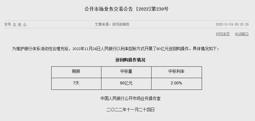 中新经纬11月24日电 为维护银行体系流动性合理充裕,央行11月24日以利率招标方式开展了80亿元7天期逆回购操作;中标利率2.0%,与此前持平。 ![]() 截图来源:央行网站 Wind数据显示,今日1320亿元逆回购到期,因此当日净回笼1240亿元。本周央行公开市场将有4010亿元逆回购到期,其中周一至周五分别到期50亿元、1720亿元、710亿元、1320亿元、210亿元。 值得一提的是,11月22日召开的国常会提出,加大金融支持实体经济力度。引导银行对普惠小微存量贷款适度让利,继续做好交通物流金融服务,加大对民营企业发债的支持力度,适时适度运用降准等货币政策工具,保持流动性合理充裕。 央行、银保监会近日正式发布《关于做好当前金融支持房地产市场平稳健康发展工作的通知》。《通知》明确,稳定房地产开发贷款投放。坚持“两个毫不动摇”,对国有、民营等各类房地产企业一视同仁。鼓励金融机构重点支持治理完善、聚焦主业、资质良好的房地产企业稳健发展。金融机构要合理区分项目子公司风险与集团控股公司风险,在保证债权安全、资金封闭运作的前提下,按照市场化原则满足房地产项目合理融资需求。支持项目主办行和银团贷款模式,强化贷款审批、发放、收回全流程管理,切实保障资金安全。 此外,央行、银保监会11月21日联合召开全国性商业银行信贷工作座谈会,研究部署金融支持稳经济大盘政策措施落实工作。会议指出,全国性商业银行要增强责任担当,发挥“头雁”作用,主动靠前发力。要用好政策性开发性金融工具,扩大中长期贷款投放,推动加快形成更多实物工作量,更好发挥有效投资的关键作用。 |