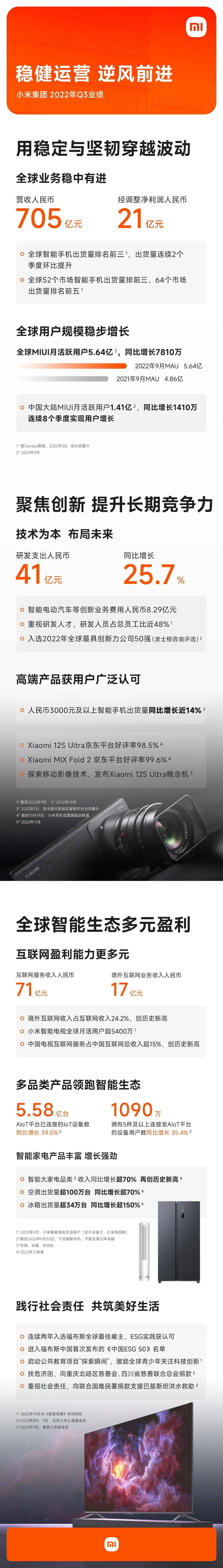 11月23日,小米集团披露2022年第三季度业绩公告。报告期内总收入达人民币705亿元,经调整净利润人民币21亿元,其中包含智能电动汽车等创新业务费用人民币8.29亿元。本季度研发支出人民币41亿元,同比增长25.7%,截至2022年9月,研发人员在员工总人数中占比达约48%。 尽管外部环境复杂多变,小米全球各项业务稳健运营,业绩环比改善,且稳中有进。商业模式展示出强劲的韧性。 小米智能手机全球出货量再次环比提升。根据Canalys数据,本季度小米全球智能手机出货量排名保持第三,市占率为13.6%。在全球52个市场智能手机出货量排前三,64个市场智能手机出货量排前五,其中小米在欧洲地区智能手机出货量市占率23.3%,排名第二。 ![]() 在此基础上,小米全球用户规模稳定增长。2022年Q3,小米在全球及中国大陆的MIUI月活用户数再创新高。2022年9月,全球MIUI月活用户数达5.64亿,中国大陆MIUI月活用户数达1.41亿。其中,中国大陆MIUI月活用户数已连续8个季度实现用户递增。 随着全球市场深入运营和用户规模扩大,小米全球商业模式迸发活力。2022年Q3,小米境外互联网业务收入人民币17亿元,同比增长17.2%,占整体互联网服务收入比重连续6个季度环比提升并创单季历史新高,达24.2%。 本季度小米积极布局智能科技生态,截至2022年9月30日,小米AIoT平台已连接IoT设备(不包括智能手机、平板及笔记本电脑)数5.58亿;拥有五件以上连接至小米AIoT平台的设备(不包括智能手机、平板及笔记本电脑)用户数1090万。智能大家电品类(空调、冰箱、洗衣机)收入在本季度延续强势增长,实现同比超70%的大幅增长,再创历史新高。小米以高端科技体验赋能智能生活生态,多维助力业绩增长。 小米商业模式全球发力,海外互联网收入占比连续扩大 虽受外围环境扰动,全球手机大盘延续弱势,但小米智能手机在逆境中仍展现出极强稳定性。据Canalys数据显示,Q3小米全球智能手机出货量排名保持第三,市占率达13.6%,出货量已连续2个季度环比提升。 得益于小米在全球多市场的本地化成熟运营,主力市场地位持续领先,新兴市场稳步开拓。据Canalys数据, 2022年Q3,按智能手机出货量计,小米在全球52个市场排名前三,在全球64个市场排名前五,并在欧洲、拉美、中东等区域均实现智能手机市场份额同比提升。其中小米在欧洲市占率达23.3%,排名第二;西班牙智能手机市占率排名第一。随着全球业务的深入拓展,小米全球用户规模继续扩大,2022年9月,全球MIUI月活用户数再创历史新高达5.64亿,同比增长7810万。 在全球化战略的扎实推进下,海外商业变现能力提升,2022年Q3,小米境外互联网业务收入达人民币17亿元,同比增长17.2%,在整体互联网服务收入的占比24.2%,境外互联网收入占比,已经连续6个季度持续增长,小米的商业模式在全球范围发力。 加码研发突破创新,高端实力获市场高度认可 小米始终坚持技术为本,加码研发,以科技创新带动产品力提升。2022年Q3,小米研发支出达人民币41亿元,同比增长25.7%。公司研发人员占员工总数的比重达约48%,研发团队规模持续扩大。 前三季度以来,小米持续发力高端化,以优越的产品力和极致体验赢得高端市场口碑。通过对手机影像技术的极致探索,小米推出与徕卡合作的高端影像旗舰手机Xiaomi 12S Ultra;同时,持续探索折叠屏体验,推出Xiaomi MIX Fold 2折叠屏高端旗舰手机,其超轻薄使用体验持续吸引更多商务人群。截至10月19日,两款高端机型在京东平台好评率分别达到98.5%和99.6%。得益于小米在高端市场的持续进化,2022年Q3小米中国大陆地区智能手机ASP同比增长约9%,人民币3000元以上智能手机出货量实现同比约14%的增长。 小米也致力于提升高端产品的互联互通。报告期内,小米Xiaomi Buds 4 Pro和Xiaomi Watch S1 Pro两款高端可穿戴新品,自2022年8月11日发售起至2022年10月31日,连接用户中,小米高端手机产品用户占比超50%(据内部未去重数据,高端手机产品定义为中国大陆地区定价在人民币3000元及以上的机型)。 在巩固原有技术优势的同时,小米积极探索创新,布局前沿科技。本季度小米智能电动汽车等创新业务费用达人民币8.29亿元。而小米所展现出的创新活力也获得国际市场认可, 2022年10月,小米入选波士顿咨询(BCG)评选的「2022年全球最具创新力公司50强」。 全场景智能生态布局,智能大家电收入同比涨超70% 随着智能时代的到来,小米万物互联领先优势更加突出。本季度,小米手机× AIoT战略持续发力,截至2022年9月30日,小米AIoT平台已连接的IoT设备(不包括智能手机、平板及笔记本电脑)数达5.58亿,同比增长39.5%;拥有五件及以上连接至AIoT平台的设备(不包括智能手机、平板机笔记本电脑)用户数同比增35.4%,达1090万。随着智能生态日益完善,小米对用户的吸引也明显增强, 2022年9月,小爱同学月活跃用户数同比增长9.0%,达1.15亿,米家APP月活用户数同比增长20.9%,达7240万。 报告期内,小米不仅用户基数及智能生态布局实力显著提升,同时持续构建全场景智能体验,带来了更加丰富的多场景智能产品。 2022年Q3,小米智能大家电品类(空调、冰箱、洗衣机)保持强劲增长,收入同比增长超70%,再创历史新高。其中,空调产品出货量同比增长超70%,超100万台,冰箱产品出货量超34万台,同比增长超150%。 此外,基于对市场需求的敏锐洞察以及对创新技术的探索,2022年Q3,小米推出米家户外电源1000Pro和米家太阳能板100W两款生态链新品,