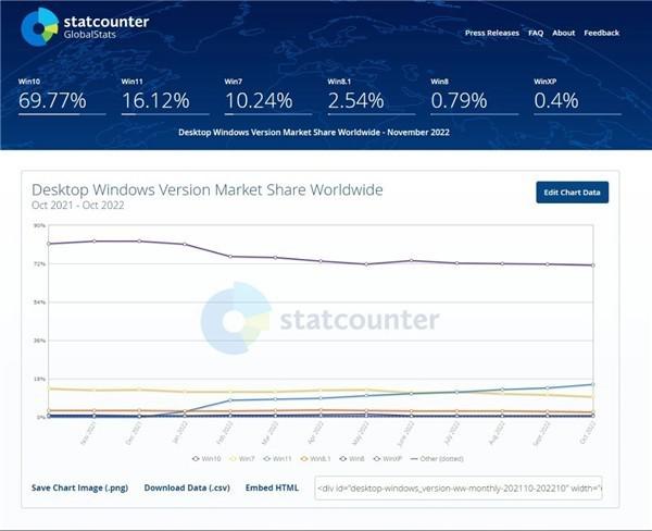 另外根据数据来看,Windows 7 系统依然受到不少用户欢迎,市场份额仍有 10.24,而且还出现了 0.62% 的小幅增长。不得不说 Windows 11 系统目前处境还是比较尴尬的。