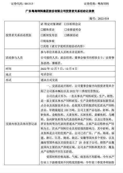广东粤海饲料集团股份有限公司(以下简称“粤海饲料”或“公司”)12月10日发布公告称,公司于12月7日、12月8日接受了多家机构投资者的特定对象调研。在调研中,粤海饲料透露,预制菜是近年一个非常热门的话题,粤海也在摸索和发展水产品加工业务,公司计划通过全资子公司湛江粤海水产有限公司投资26,000万元开展海洋食品加工中心项目,为扩大公司业务收入和利润规模创造良好条件,同时进一步巩固和提升公司在水产品行业中的地位和市场竞争力。各项工作正在有序推进中。 ![]() ▲粤海饲料公告截图 粤海饲料公司董事会秘书向投资者介绍了公司基本概况以及2022年三季度经营情况。粤海饲料称,公司自成立至今,一直从事水产饲料研发、生产、销售,是一家主要从事水产饲料研发、生产及销售的国家创新型试点企业及高新技术企业,是我国大型的集团化优质水产饲料企业,年销量超过100万吨。公司主要产品包括:虾料、海鲈鱼料、金鲳鱼料、大黄鱼料、石斑鱼料、黄颡鱼料、乌鳢料、加州鲈鱼料等为代表的特种水产饲料,以及以草鱼料、罗非鱼料等为代表的普通水产饲料,主要产品以特种水产饲料为主,在水产饲料行业具有较强的影响力,其中虾料、海水鱼料是公司的优势产品,公司已在广东、广西、海南、福建、浙江、江苏、湖南、湖北、安徽等国内多个省份,以及越南等国外地区共投资设立了20余家子公司,销售产品覆盖国内主要的水产养殖区域。公司水产饲料种类齐全,覆盖水产动物的不同生长阶段。 受原材料价格高涨、气候、病害的不利影响,今年水产行业上下游都受到不同程度的影响,今年前三季度净利润指标与去年同期相比有较明显的下降,但在总体上实现扭亏为盈。2022年前三季度,公司实现营业收入55.72亿元,同比增长6.2%,实现归属于上市公司股东的净利润4,431.89万元,同比下降72.27%。第三季度以来为了应对严峻的市场形势,公司采取了一系列有效措施,进行比较大力度的变革,第三季度整体的生产经营业绩也获得比较好的增长,第三季度公司实现单季度营业收入28.38亿元,同比增长6.45%,实现归属于上市公司股东的净利润为9,720.28万元,同比增长1.33%。 以下为问答环节主要内容: 1、公司单三季度以来经营情况大幅好转,主要原因是什么? 答:针对今年原材料价格持续高涨、天气、病害、疫情封控等较多不利因素的影响,第三季度以来,公司一方面根据原材料对生产成本影响程度并结合市场情况对产品销售价格进行较大适度的提升,另一方面也采取了一些变革措施,并取得了较好的成效。如进一步优化产品配方结构,提升产品配方技术水平,在保证产品质量的前提下适当进行相对低价原料替代,同时强化采购与技术的联动,切实保证原料技术替代所需质优且相对价廉的替代原料需求,较好的控制配方成本;优化营销组织结构,完善营销考核机制,让业务人员更多的去服务终端客户和开发新客户实现增量,存量客户交由营销干部来负责管理,加大增量奖励力度,降低原有存量奖励标准,对业绩完成率较低的人员进行适度的降职降薪,淘汰少部分业绩完成率过差的人员,较好的提高了业务团队的积极性和开拓市场的力度,营销人效得到较好提升;优化产品结构,侧重于高附加值产品的生产与销售,适度淘汰部分低附加值且需求量少或发展前景小的产品,对公司经营效益产生较好的成果;内部挖潜革新,降本降费增效,通过对生产工艺进行改造和提升进一步降低生产成本与费用等。 2、从饲料销量和单吨净利情况来看,单三季度相比上半年发生了什么样的变化? 答:针对原材料价格持续高涨的不利因素,第三季度以来,公司一方面根据原材料对生产成本影响程度并结合市场情况相应对产品销售价格进行了较大适度的提升,另一方面也采取了一些变革措施,如在保证产品质量的前提下加大相对低价原料技术替代力度,控制配方成本,优化产品结构,加大高附加值产品的营销力度,适度淘汰部分低附加值且需求量少或发展前景小的产品,争取提升整体利润率水平等。就销量来说,单三季度饲料销量较上年同期有略微下降,上半年销量与上年同期相比有2.77%的增长,但单三季度营收与上年同期相比有6.45%的增长,上半年营收与上年同期相比增长是5.95%;三季度毛利率与上年同期相比下降3.4%,上半年毛利率与去年同期相比下降有5.2%,三季度毛利率较上半年略有提升。 3、预计四季度来看向上的趋势是否还会持续? 答:10、11月原材料价格仍有较大幅度的上涨,就目前情况来看,原材料价格还将持续高位。第四季度,原材料价格持续高涨严峻的市场形势及疫情封控持续不断的不利因素仍然存在。公司将进一步提升内部经营与管理效率,持续进行内部挖潜革新,充分发挥公司市场采购优势,完善考核激励机制,深入推进经营创效,全力以赴降成本、提质量、增效益,公司有信心应对市场风险,做好各项生产经营工作,争取取得合理利润以回报广大投资者。 4、今年以来原材料成本的上行对于公司有多大的影响? 答:公司产品成本中的原材料成本占比达90%以上,公司盈利水平受原材料价格波动影响较大,包括鱼粉、豆粕、鸡肉粉、菜粕以及其他蛋白类原料。今年以来原材料价格持续高涨,粮食类、豆粕类、鱼粉类原料价格大幅度的增长,增长的幅度达到20%-30%,部分原材料价格个别时期甚至将近翻翻。尽管饲