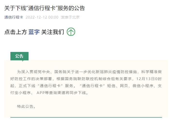 为深入贯彻党中央、国务院关于进一步优化新冠肺炎疫情防控措施,科学精准做好防控工作的决策部署,根据国务院联防联控机制综合组有关要求,12 月 13 日 0 时起,正式下线 " 通信行程卡 " 服务。" 通信行程卡 " 短信、网页、微信小程序、支付宝小程序、 APP 等查询渠道将同步下线。
