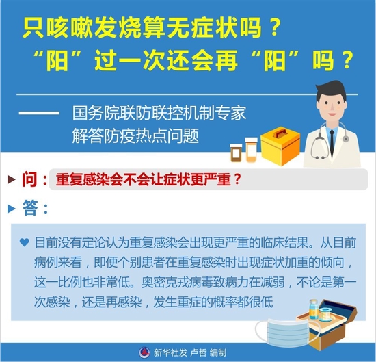 答:目前没有定论认为重复感染会出现更严重的临床结果。从目前病例来看,即便个别患者在重复感染时出现症状加重的倾向,这一比例也非常低。奥密克戎病毒致病力在减弱,不论是第一次感染,还是再感染,发生重症的概率都很低。