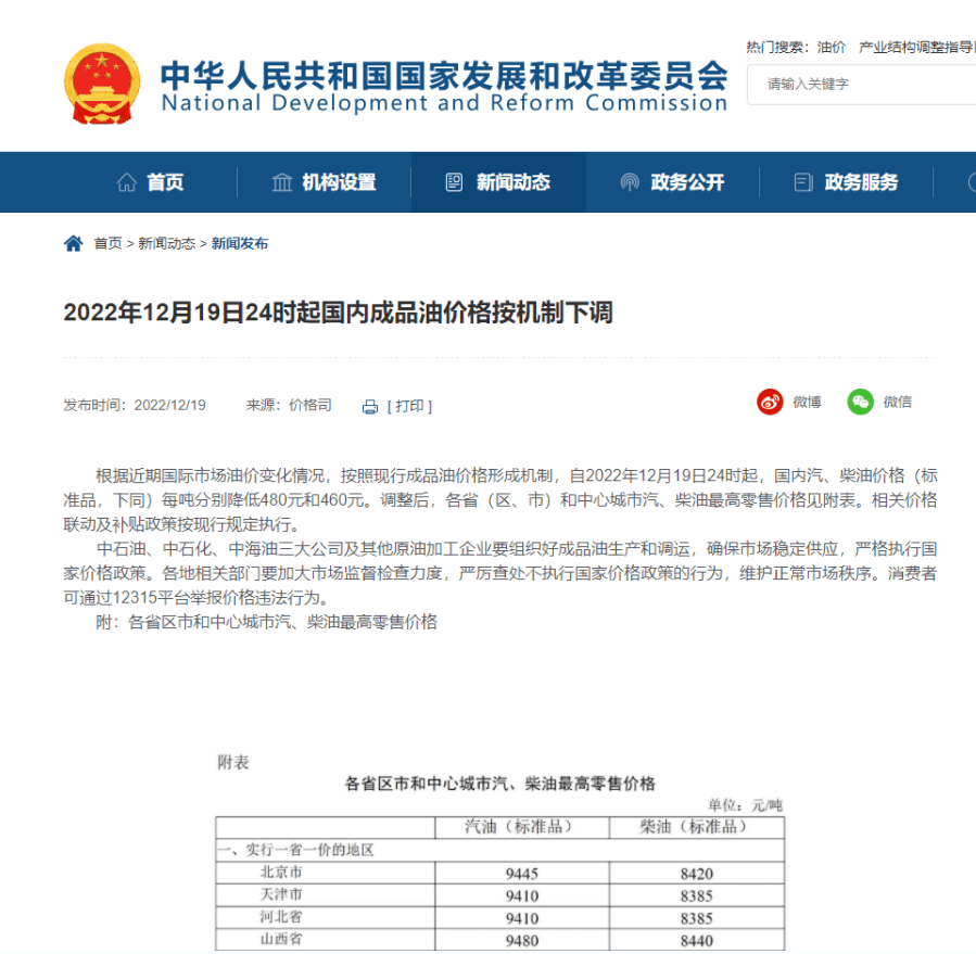 据国家发展和改革委员会官网消息,根据近期国际市场油价变化情况,按照现行成品油价格形成机制, 自2022年12月19日24时起,国内汽、柴油价格每吨分别降低480元和460元。相关价格联动及补贴政策按现行规定执行。 ![]() 来源:国家发展和改革委员会官网 责任编辑:毕丹丹 —— / 好文推荐 / ——