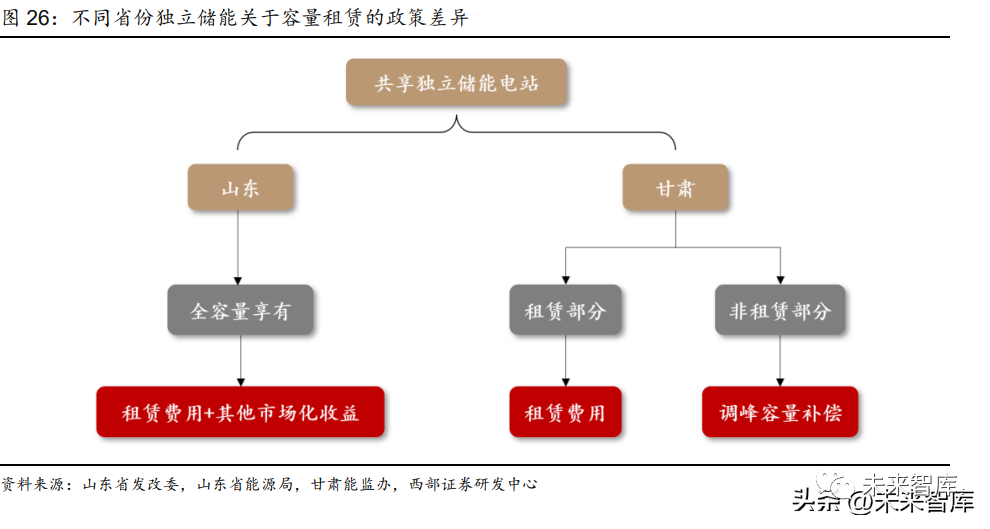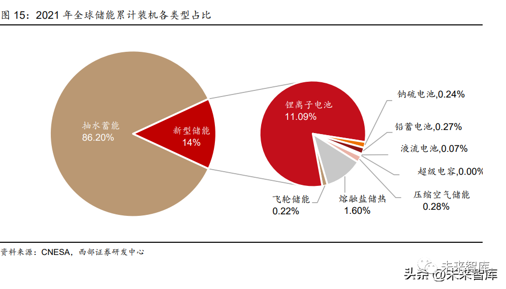 ![]() 一、储能广泛应用于源网荷,保障新能源消纳 1.1 风光装机占比不断提升,电力系统面临挑战 国内外风电光伏装机量快速提升,有望在未来能源结构中占据重要地位。现阶段,具备规 模化开发的可再生清洁能源主要有水能、风能和太阳能,其中风能,光伏发展空间巨大, 增速较快。根据国家能源局,2021年我国风电和光伏发电占总发电量的比重分别达到7.8% 和 3.9%,风光发电量占总发电量比重首次超过 10%。我们预计,2025 年中国与全球的光 伏装机量将达到 155/600GW,风电装机量将达到 118/188GW。根据 BCG 的预计,至 2030 年我国能源装机中风电光伏的占比将接近一半,此后将在我国能源装机结构中占据愈发重 要地位。 光伏、风电属于不稳定出力电源,影响电力系统稳定性。光伏、风电等新能源具有波动性、 间歇性与随机性等特性,风电出力日内波动幅度最高可达 80%,出力高峰出现在凌晨前后, 午后到最低点,“逆负荷”特性更明显,光伏日内波动幅度 100%,峰谷特性鲜明,正午 达到当日波峰,正午前后均呈均匀回落态势,夜间出力为 0,此外光伏易受天气影响,天 气阴晴对光伏发电系统实际有功功率的影响非常明显,因此每日的实际有功功率也具有一 定随机性。正是风电和光伏的这些不稳定的特点对发电量预测造成了难度,因此二者均属 于不稳定出力的电源。随着风电光伏的大规模发展,并逐渐成为主流能源,这种间歇性、 不稳定的能源将在发电端和用户端大规模装机,该情景下整个电力系统的平衡将难以实现。 ![]() 储能是实现“碳达峰、碳中和”目标的重要支撑技术。目前电力系统是发输配用的单向平 衡,通过发电端的调节达到与用户端的负荷平衡,且通过电网的调度来实现该功能。在新 一轮能源革命中,如何有效抑制新能源发电的间歇性、波动性,提高新能源大规模并网发 电稳定性成为关键性问题。为了实现以可再生能源为主体的电力系统的负荷平衡,储能将 成为其关键支撑技术。储能技术的发展应用有利于平抑新能源电网波动,促进可再生能源 消纳,推动主体能源由化石能源向可再生能源更替,助力早日实现“双碳”目标。 1.2 储能广泛应用于源网荷,重要性不断凸显 储能行业应用场景丰富,主要可分为电源侧、电网侧和用户侧三类。电源侧对储能的需求 场景类型较多,包括可再生能源并网、电力调峰、系统调频等;电网侧储能主要发挥支撑 电力保供、提升系统调节能力、支撑新能源高比例外送以及替代输配电工程投资等作用;用户侧储能主要用于电力自发自用、峰谷价差套利、容量电费管理和提高供电可靠性等。然而,在实际应用中,储能的某一功能应用并不局限于单一应用场景,以平滑输出、跟踪 出力计划为例,可同时应用于电源侧、电网侧和用户侧。从新型储能的应用分布上看,根据 CNESA,2022 年前三季度依旧是电网侧的新增装机规模最大,达到 512.8MW,占据 新型储能一半以上的市场份额,而网侧项目中有 60%以上的份额是来自独立储能。 1.2.1 发电侧:新能源并网与电力调峰的重要保障 储能在电源侧的主要应用场景包括可再生能源并网、电力调峰、辅助动态运行、系统调频 等方面。在当前政策框架下,电源侧储能电站的收益点主要为削峰填谷带来的增发收益, 跟踪发电计划避免考核所带来的损失等。此外,配备储能的光伏、风电项目也更容易获取 新能源建设并网的指标。在未来准许可再生能源+储能参与电力辅助服务市场,明确调峰 补偿后,电源侧储能还可获得参与电力辅助服务市场获取的收益和深度调峰收益。 ![]() 1.2.2 电网侧:构建新型电力系统的重要支撑 促进局部地区新能源消纳、替代输变电工程投资是当前电网侧新型储能主要功能。根据电 规总院,当前我国已投运电网侧新型储能项目主要集中在山东、江苏、河南、湖南、青海、 浙江、广东、福建等省份。当前电网侧新型储能发挥功能以促进局部地区新能源消纳、替 代输变电工程投资为主。结合电力系统需求,电网侧新型储能本应发挥一些综合性、全局 性功能,但是目前仍缺乏明确定位。 电网侧新型储能是未来新型电力系统构建的重要支撑。相比电源侧和负荷侧储能,电网侧 新型储能布局在电网关键节点,单站规模较大,接入电压等级较高,且具备独立运行条件, 因此更适宜参与全局统一调控,更具备系统性、全局性优势。以电力系统实际需求为导向, 电网侧新型储能布局重点考虑支撑电力保供、提升系统调节能力、支撑高比例新能源外送、 替代输配电工程投资四大应用场景。根据电规总院,综合考虑以上四类应用场景,“十四 五”全国电网侧新型储能总需求规模约 5500 万千瓦,时长 2~4 小时。应用场景以支撑电 力保供、提升地区电力系统调节能力为主,三北地区规模需求略高于中东部地区。 1.2.3 用户侧:提升电力自发自用水平与峰谷价差套利 储能在用户侧的主要应用场景包括电力自发自用水平提升、峰谷价差套利、容量费用管理、 提升电力可靠性和提高电能质量等方面。在当前政策框架下,用户侧储能电站的收益主要 来自于峰谷价差带来的电费节省。在未来落实分布式可再生能源+储能参与电力辅助服务 市场机制,补偿需求响应价值等政策进一步完善的情况下,用户侧储能电站的收益还可包 括需求响应收益、延缓升级容量费用收益、参与电力辅助服务市场所获取的收益等