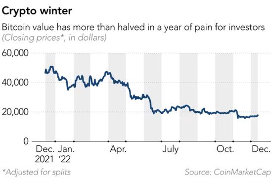 据新浪科技消息,在2022年,随着各大加密货币交易所和基金纷纷崩溃,就连最坚定的信徒都要面临信心的考验。 导火索来自新加坡。7月,随着Luna币的崩溃,加密货币对冲基金三箭资本(Three Arrows Capital)触发了整个市场的估值暴跌。“加密货币寒冬”就此开启。 混乱局面随即蔓延,就连一些更大牌的机构也被卷入其中,最著名的便是另外一家名为FTX的亚洲公司。这家交易所的创始人山姆·班克曼-弗里德(Sam Bankman-Fried)不久前还拥有数十亿美元的账面财富,但当他创立的公司在11月破产后,很快就面临美国政府的欺诈指控。 在经历了令人叹为观止的牛市之后,整个市场如今都充斥着寒意。2021年11月,所有数字货币的市值达到约3万亿美元的峰值,但在今年年中,却暴跌到不足1万亿美元。 作为整个市场最受欢迎、规模最大的加密货币,比特币也跌破1.6万美元,较去年年末的历史最高点下跌近80%,目前仍未突破1.7万美元。 这次溃败不仅压制了投资者对数字资产的热情,还在整个行业引发了规模多达数千人的裁员潮,许多业内领先的企业甚至预测,加密货币市场还将迎来更加刺骨的严寒。