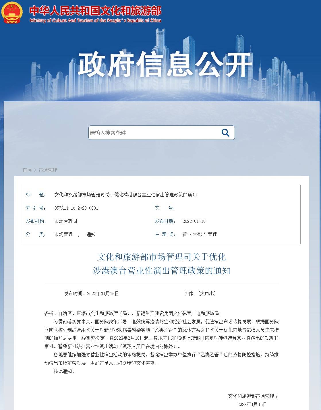 1月16日,文旅部官网发布“文化和旅游部市场管理司关于优化涉港澳台营业性演出管理政策的通知”。 ![]() 据文旅部消息,为贯彻落实党中央、国务院决策部署,高效统筹疫情防控和经济社会发展,促进演出市场恢复发展,根据国务院联防联控机制综合组《关于对新型冠状病毒感染实施“乙类乙管”的总体方案》和《关于优化内地与港澳人员往来措施的通知》要求,经研究决定,自2023年2月16日起,各地文化和旅游行政部门恢复对涉港澳台营业性演出的受理和审批。 通知全文: 各省、自治区、直辖市文化和旅游厅(局),新疆生产建设兵团文化体育广电和旅游局: 为贯彻落实党中央、国务院决策部署,高效统筹疫情防控和经济社会发展,促进演出市场恢复发展,根据国务院联防联控机制综合组《关于对新型冠状病毒感染实施“乙类乙管”的总体方案》和《关于优化内地与港澳人员往来措施的通知》要求,经研究决定,自2023年2月16日起,各地文化和旅游行政部门恢复对涉港澳台营业性演出的受理和审批。暂缓新批涉外营业性演出活动(演职人员已在境内的除外)。 各地要继续加强对营业性演出活动的审核把关,督促演出举办单位执行“乙类乙管”后的疫情防控措施,持续推动演出市场繁荣发展,更好满足人民群众精神文化需求。 【来源:九派新闻综合文旅部官网】 |