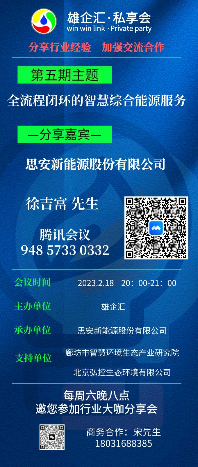 会议录制:雄企汇·私享会 日期:2023-02-18 19:05:02 视频回放:https://meeting.tencent.com/v2/cloud-record/share?id=78518707-92f8-4c21-b017-b3f081d33164&from=3 第五期 全流程闭环的智慧综合能源服务 有需要的朋友,可以点击上面链接在线观看。 雄企汇·私享会每周六晚上都定期邀请一位行业大咖上线分享,欢迎扫描上面海报二维码,商务合作请与宋先生18031688385联系。 |