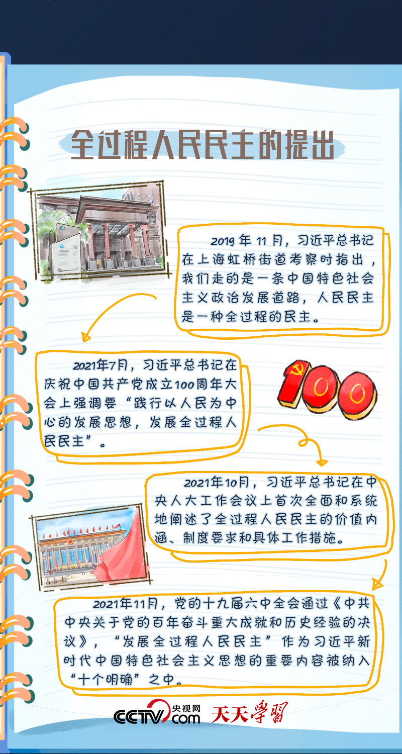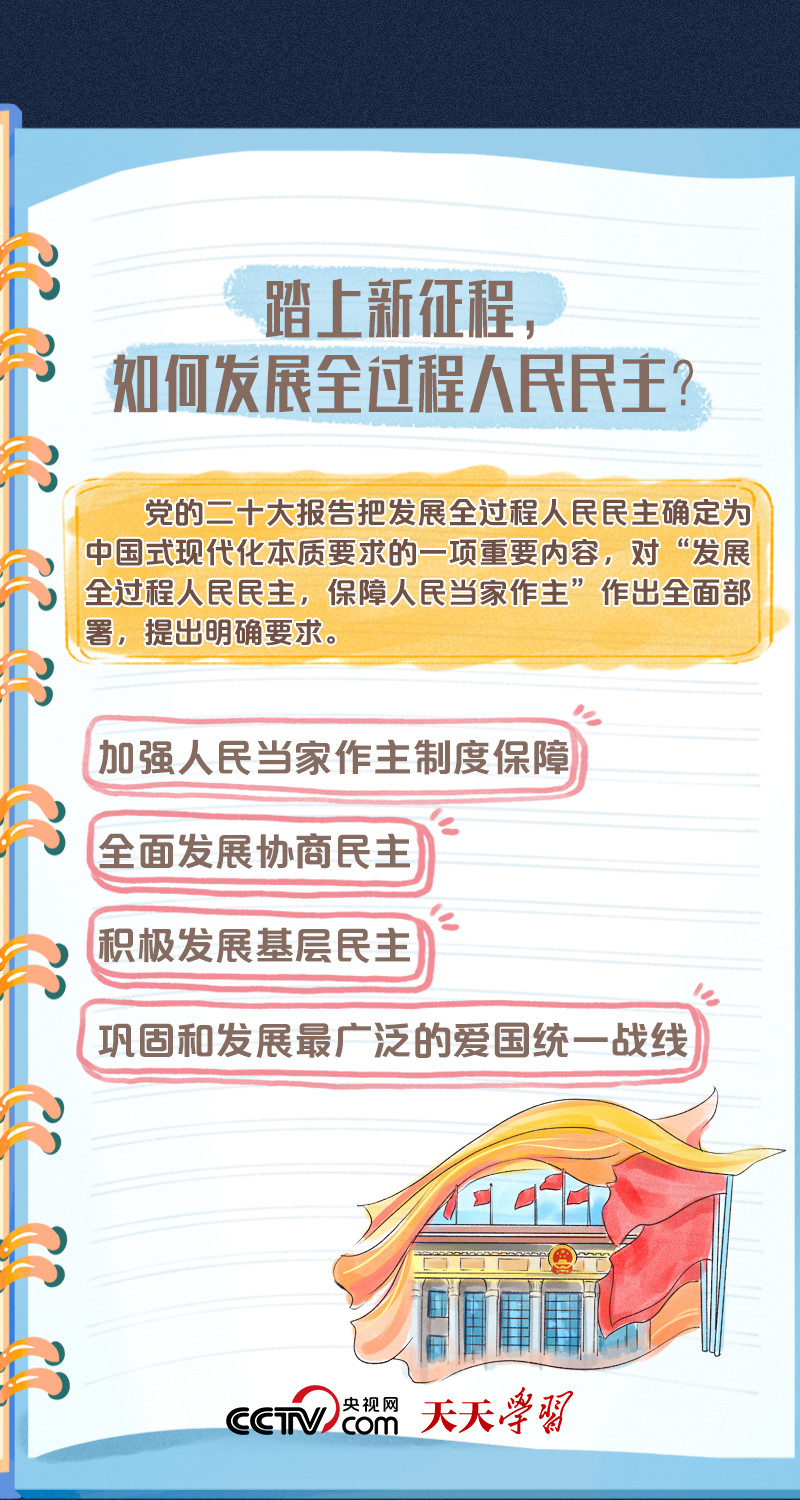 编者按:党的二十大报告深刻阐述了开辟马克思主义中国化时代化新境界、中国式现代化的中国特色和本质要求等重大问题,擘画了全面建成社会主义现代化强国的宏伟蓝图和实践路径。如何深入学习领会党的二十大报告的思想精髓与核心要义?央视网《天天学习》推出“二十大报告学习笔记”系列互动海报,带您“沉浸式”解读党的二十大报告关键词。 | 天天学习 |党的二十大报告指出,发展全过程人民民主,保障人民当家作主。全过程人民民主是社会主义民主政治的本质属性,对于新时代新征程更好发挥我国社会主义政治制度优势、全面建设社会主义现代化国家、全面推进中华民族伟大复兴,具有十分重要的意义。 ![]() ![]() ![]() ![]() ![]() ![]() ![]() |