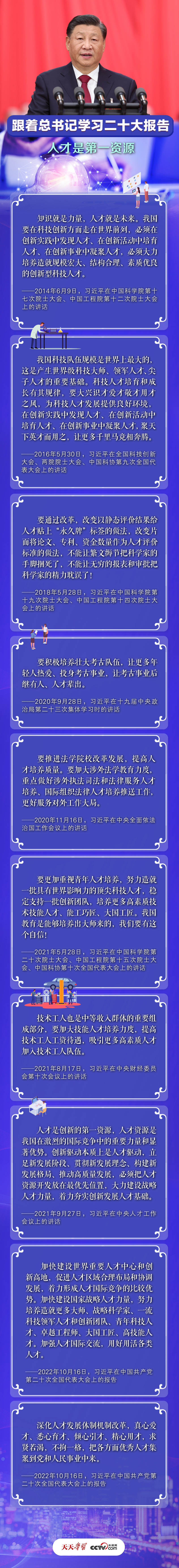 党的二十大报告指出,必须坚持科技是第一生产力、人才是第一资源、创新是第一动力,深入实施科教兴国战略、人才强国战略、创新驱动发展战略,开辟发展新领域新赛道,不断塑造发展新动能新优势。 千秋基业,人才为先。习近平总书记多次强调“实施人才强国战略”,并对培养造就德才兼备的高素质人才作出具体部署。央视网《天天学习》为您梳理相关重要论述,与您一起学习。 ![]() |
