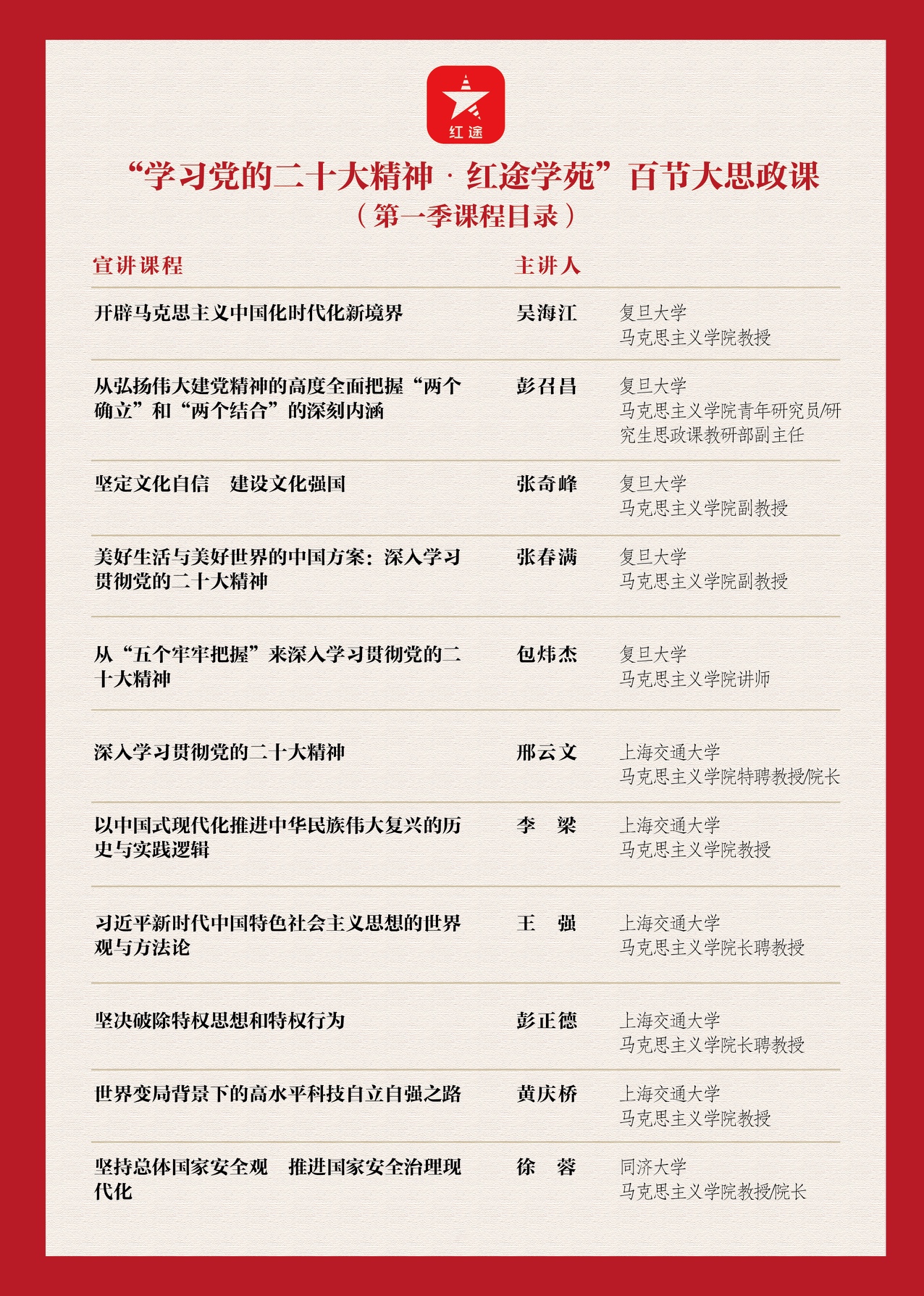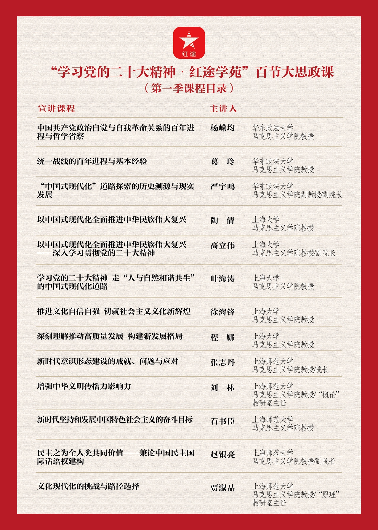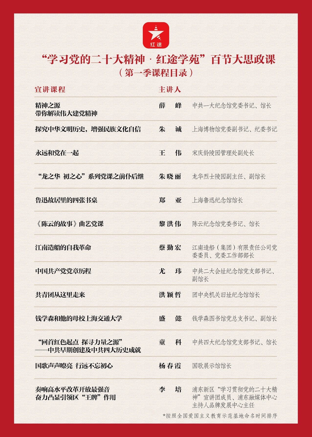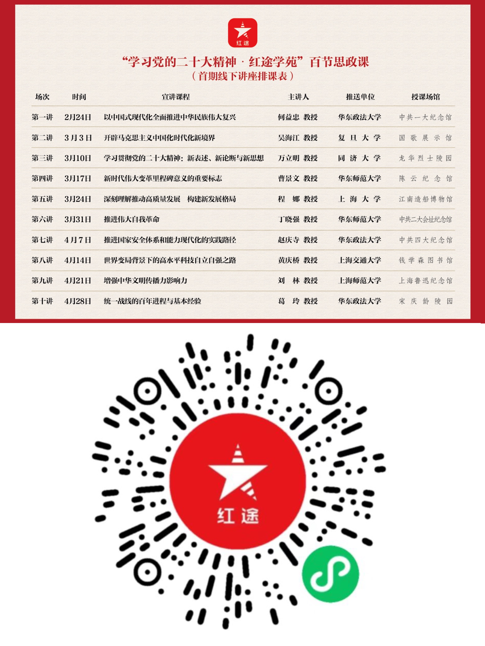 2月15日下午,“学习党的二十大精神”——红途学苑“双百”活动启动仪式在上海社会科学馆报告厅举行,现场发布了“学习党的二十大精神”红途学苑百节大思政课第一季目录和百场精品活动第一季菜单。 ![]() “学习党的二十大精神”——红途学苑“双百”活动启动仪式现场。澎湃新闻记者 俞凯 图 今年是全面贯彻落实党的二十大精神的开局之年,上海市委宣传部会同市委网信办、市教卫工作党委、市教委、市精神文明办、上海警备区政治工作局、市国资委党委等部门,重点推出“学习党的二十大精神”红途学苑“双百”活动,汇聚本市重点高校马克思主义学院师资力量,发动各级爱国主义教育基地、新时代文明实践中心,推出百节大思政课、百场精品活动。 澎湃新闻(www.thepaper.cn)记者从启动仪式上获悉,红途学苑将以线下讲座、线上直播、音视频课程、精品活动等多种形式,结合基层学习需求,通过在线预约、专题配送等方式进场馆、进企业、进农村、进机关、进校园、进社区、进军营,切实发挥理论团队、宣教阵地、融媒中心、“红途”平台矩阵效应,打造具有上海特色的党的二十大精神宣讲课堂。 其中,“红途学苑”百节大思政课预计推出两期共100节,第一季发布50节大思政课,由“专家说”和“馆长说”组成。“专家说”邀请来自复旦大学、上海交通大学、同济大学、华东师范大学、华东政法大学、上海大学、上海师范大学首批7所高校马克思主义学院的专家学者,围绕党的二十大提出的一系列重要思想、重要观点、重大论断、重大举措进行宣传阐释。“馆长说”则由中共一大纪念馆等国家级爱国主义教育示范基地馆长,结合党的二十大精神和场馆展陈研究,研发推出系列课程。 “红途学苑”大思政课包括线下讲座、邀约授课和线上课程。线下讲座将于2月24日起,每周五下午14点在中共一大纪念馆等13个国家级爱国主义教育示范基地陆续开展首批精品讲座,由7所高校知名专家教授带来主题多元的课程宣讲,面向公众开放预约。邀约授课面向全市发布两批共100节大思政课课程名单,本市各级单位、党组织均可通过“红途”平台预约专家讲师,赴本单位开展线下授课,促进党的二十大精神走深走实、入脑入心。精品讲座将同步开放线上直播课程,各基层单位可预约报名参与。此外,还将精选课程制作音、视频版本,通过各区融媒体、政务新媒体及B站、阿基米德等网络平台重点推送。 “红途学苑”还将发动全市各级爱国主义教育基地,组织开展各类主题学习宣教活动,筛选形成“学习党的二十大精神”精品活动菜单并定期发布,首期发布精品活动50场,预计推出两期不少于100场活动。各级党组织、各单位团体、广大市民可通过“红途”平台预约,前往各爱国主义教育基地参观专题展览,观看实景剧目演出,参与仪式教育、红色剧本杀、劳模大学堂、艺术课堂等主题活动。 此外,“红途”平台还将聚焦新时代上海全市上下牢记嘱托、创新发展成就的代表性地点,发布少年“红途”行等寻访路线(网络版),为党员干部、青少年及家庭提供寻访导览指引。 启动仪式上,上海市委宣传部副部长、市文明办主任潘敏,市委宣传部副部长、市新闻出版局局长徐炯为首批场馆、企业、农村、机关、校园、社区、军营“红途学苑”代表授牌。“红途”平台同步上线“学习党的二十大精神”红途学苑专区。党的二十大代表、中共一大纪念馆宣教部主任杨宇、高校马克思主义学院代表黄庆桥、严宇鸣,市爱教基地代表韦沐宜,奉贤区委宣传部和奉贤九棵树爱乐乐团等带来了微宣讲、情景党课、交响音乐党课等5场形式多样的宣讲展示活动,让现场观众提前感受“红途学苑”的优秀课程与活动的魅力。 附:“红途学苑”预约操作指引 社会公众可通过“红途”微信小程序进入“红途学苑”专区,获取课程目录和精品活动信息。专区已开通线上预约系统,公众可在线预约课程活动或拨打客服电话4009988901咨询。 红途学苑百节大思政课第一季课程目录 ![]() ![]() ![]() ![]() 红途学苑第一季精品活动菜单 ![]() ![]() ![]() ![]() 首期线下讲座排课表 ![]()