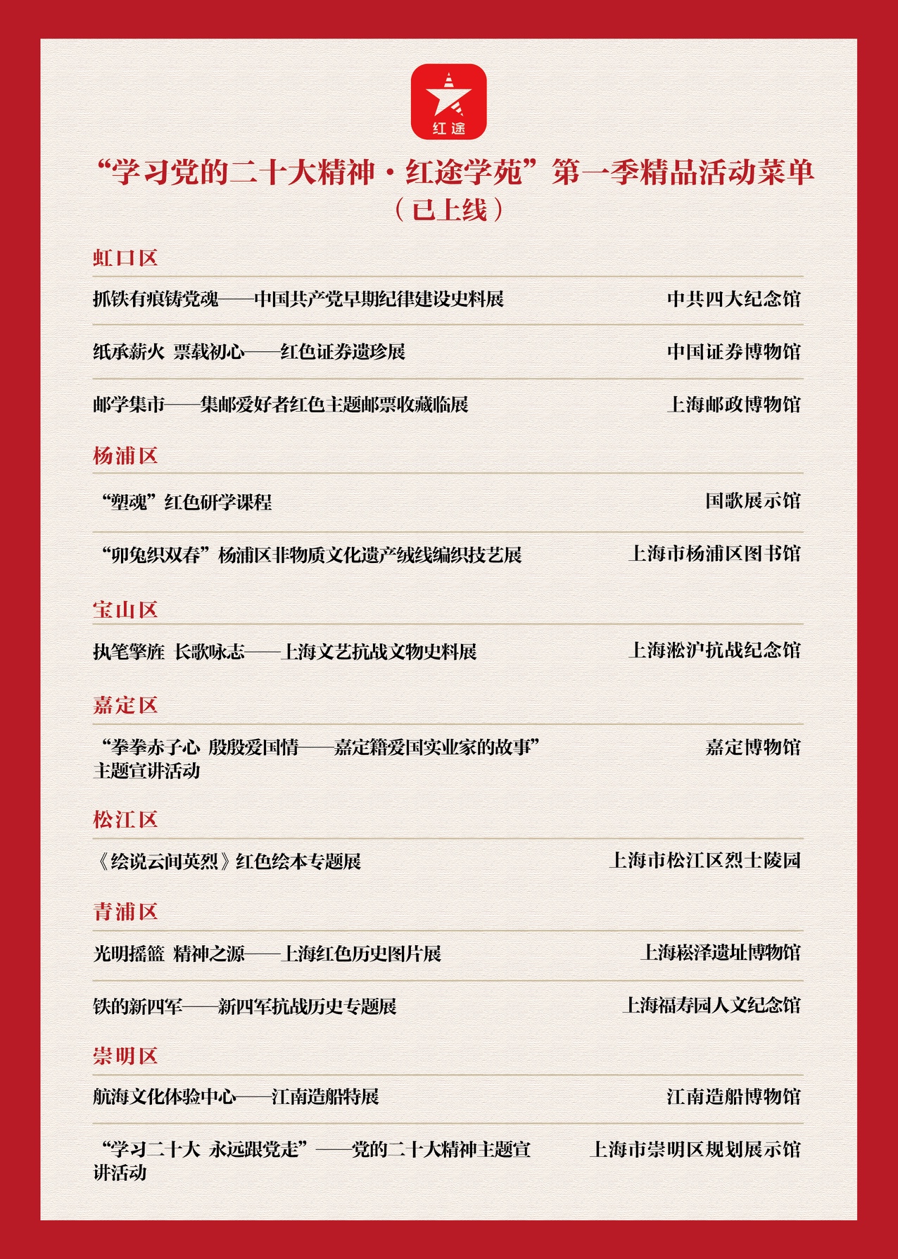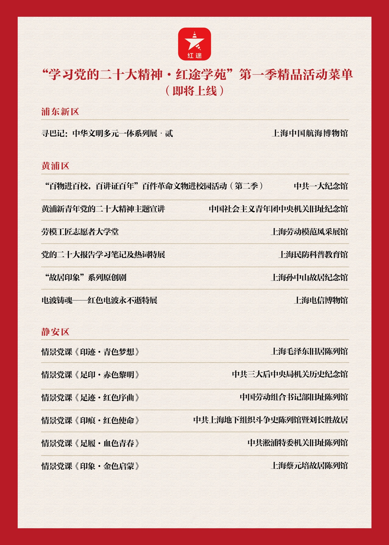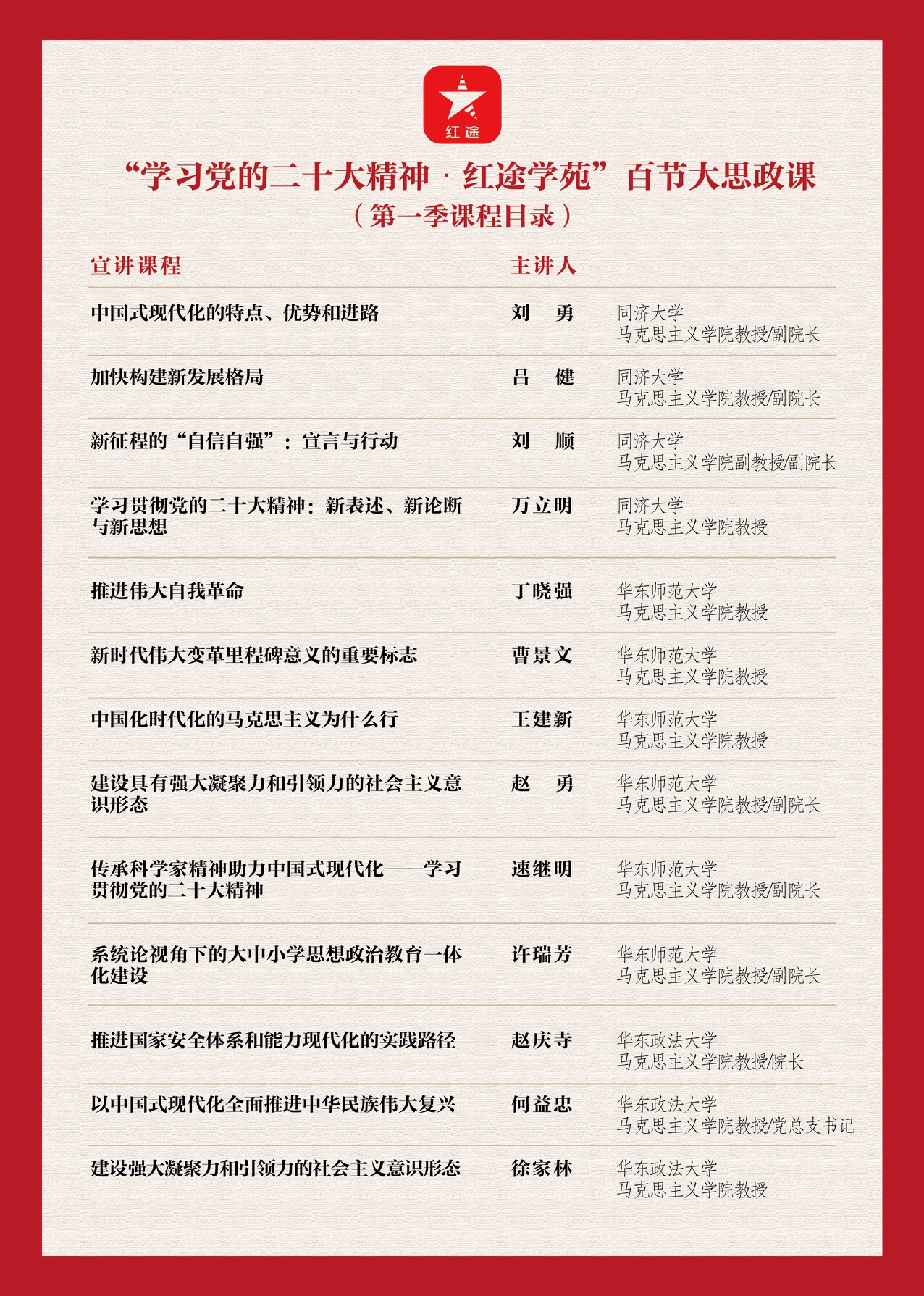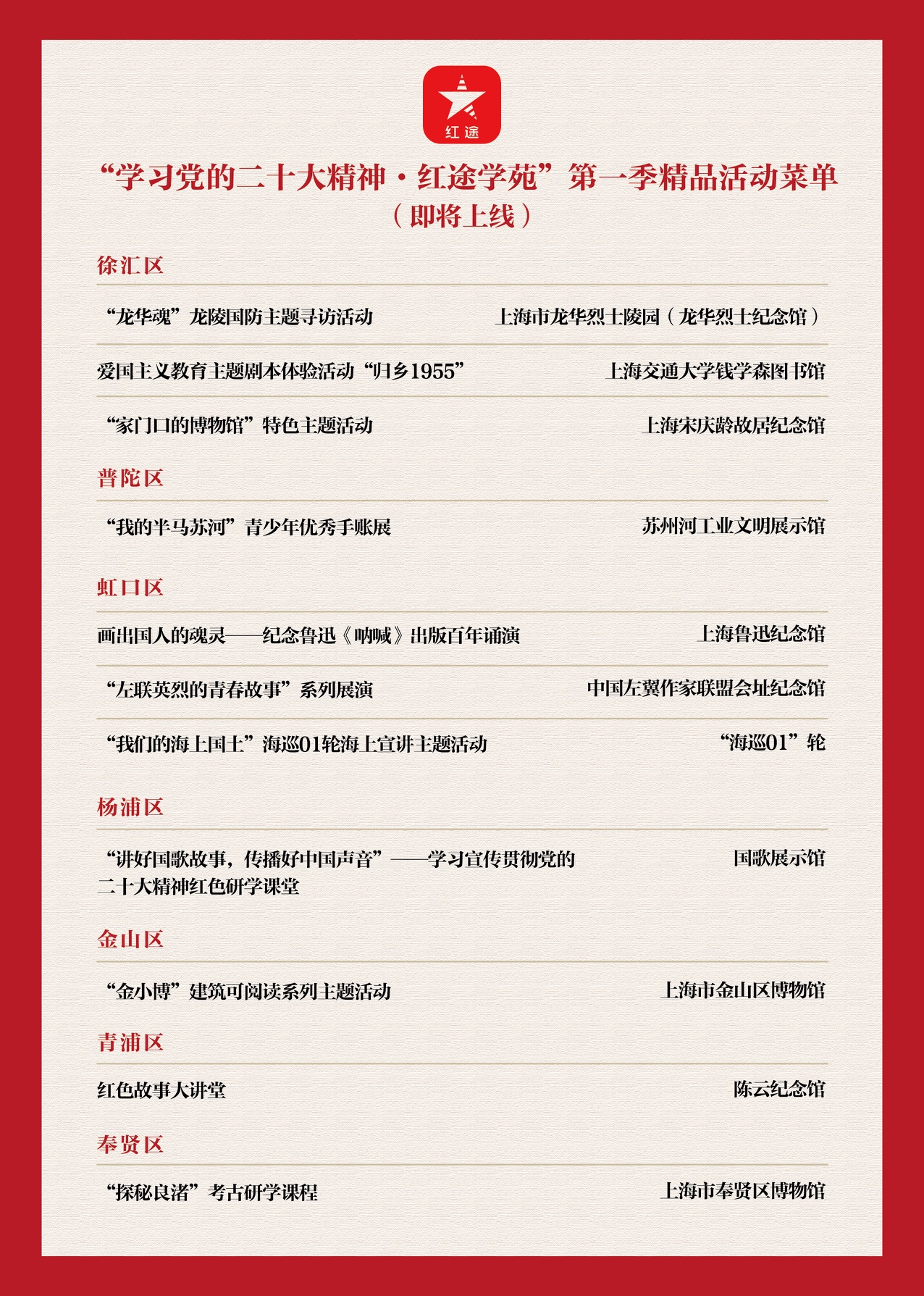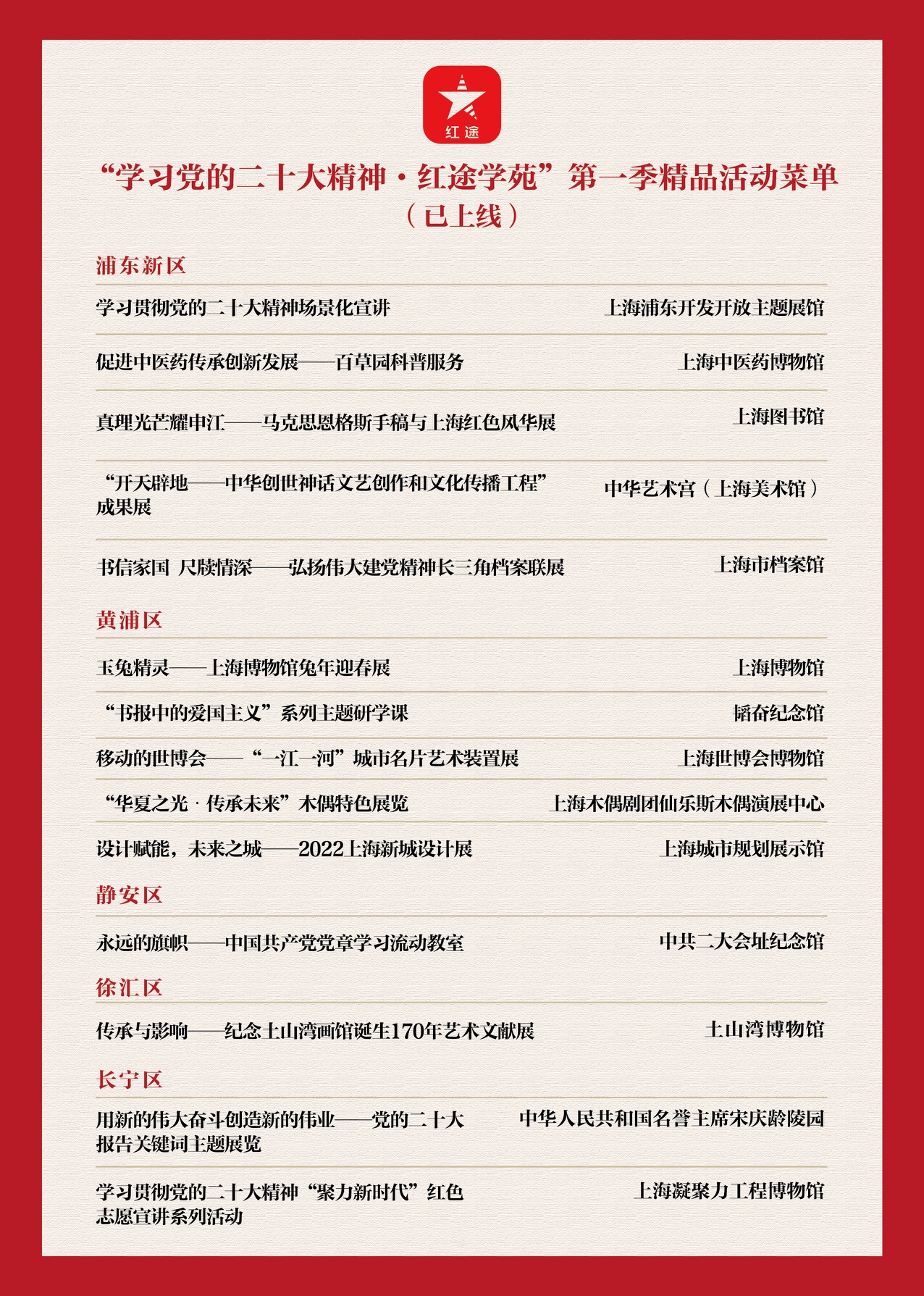 2月15日下午,“学习党的二十大精神”——红途学苑“双百”活动启动仪式在上海社会科学馆报告厅举行,现场发布了“学习党的二十大精神”红途学苑百节大思政课第一季目录和百场精品活动第一季菜单。 ![]() “学习党的二十大精神”——红途学苑“双百”活动启动仪式现场。澎湃新闻记者 俞凯 图 今年是全面贯彻落实党的二十大精神的开局之年,上海市委宣传部会同市委网信办、市教卫工作党委、市教委、市精神文明办、上海警备区政治工作局、市国资委党委等部门,重点推出“学习党的二十大精神”红途学苑“双百”活动,汇聚本市重点高校马克思主义学院师资力量,发动各级爱国主义教育基地、新时代文明实践中心,推出百节大思政课、百场精品活动。 澎湃新闻(www.thepaper.cn)记者从启动仪式上获悉,红途学苑将以线下讲座、线上直播、音视频课程、精品活动等多种形式,结合基层学习需求,通过在线预约、专题配送等方式进场馆、进企业、进农村、进机关、进校园、进社区、进军营,切实发挥理论团队、宣教阵地、融媒中心、“红途”平台矩阵效应,打造具有上海特色的党的二十大精神宣讲课堂。 其中,“红途学苑”百节大思政课预计推出两期共100节,第一季发布50节大思政课,由“专家说”和“馆长说”组成。“专家说”邀请来自复旦大学、上海交通大学、同济大学、华东师范大学、华东政法大学、上海大学、上海师范大学首批7所高校马克思主义学院的专家学者,围绕党的二十大提出的一系列重要思想、重要观点、重大论断、重大举措进行宣传阐释。“馆长说”则由中共一大纪念馆等国家级爱国主义教育示范基地馆长,结合党的二十大精神和场馆展陈研究,研发推出系列课程。 “红途学苑”大思政课包括线下讲座、邀约授课和线上课程。线下讲座将于2月24日起,每周五下午14点在中共一大纪念馆等13个国家级爱国主义教育示范基地陆续开展首批精品讲座,由7所高校知名专家教授带来主题多元的课程宣讲,面向公众开放预约。邀约授课面向全市发布两批共100节大思政课课程名单,本市各级单位、党组织均可通过“红途”平台预约专家讲师,赴本单位开展线下授课,促进党的二十大精神走深走实、入脑入心。精品讲座将同步开放线上直播课程,各基层单位可预约报名参与。此外,还将精选课程制作音、视频版本,通过各区融媒体、政务新媒体及B站、阿基米德等网络平台重点推送。 “红途学苑”还将发动全市各级爱国主义教育基地,组织开展各类主题学习宣教活动,筛选形成“学习党的二十大精神”精品活动菜单并定期发布,首期发布精品活动50场,预计推出两期不少于100场活动。各级党组织、各单位团体、广大市民可通过“红途”平台预约,前往各爱国主义教育基地参观专题展览,观看实景剧目演出,参与仪式教育、红色剧本杀、劳模大学堂、艺术课堂等主题活动。 此外,“红途”平台还将聚焦新时代上海全市上下牢记嘱托、创新发展成就的代表性地点,发布少年“红途”行等寻访路线(网络版),为党员干部、青少年及家庭提供寻访导览指引。 启动仪式上,上海市委宣传部副部长、市文明办主任潘敏,市委宣传部副部长、市新闻出版局局长徐炯为首批场馆、企业、农村、机关、校园、社区、军营“红途学苑”代表授牌。“红途”平台同步上线“学习党的二十大精神”红途学苑专区。党的二十大代表、中共一大纪念馆宣教部主任杨宇、高校马克思主义学院代表黄庆桥、严宇鸣,市爱教基地代表韦沐宜,奉贤区委宣传部和奉贤九棵树爱乐乐团等带来了微宣讲、情景党课、交响音乐党课等5场形式多样的宣讲展示活动,让现场观众提前感受“红途学苑”的优秀课程与活动的魅力。 附:“红途学苑”预约操作指引 社会公众可通过“红途”微信小程序进入“红途学苑”专区,获取课程目录和精品活动信息。专区已开通线上预约系统,公众可在线预约课程活动或拨打客服电话4009988901咨询。 红途学苑百节大思政课第一季课程目录 ![]() ![]() ![]() ![]() 红途学苑第一季精品活动菜单 ![]() ![]() ![]() ![]() 首期线下讲座排课表 ![]()