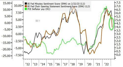 根据业内媒体的一组模型,这一次鲍威尔在议息会议后的发声,其实要比最近的趋势更为鸽派。模型的指标已经非常接近中性,显示出美联储在 5 月暂停加息的可能性显著增加。