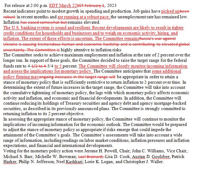美联储在会后声明中还表示," 美国银行体系健全且富有弹性,最近的事态发展可能导致家庭和企业的信贷条件收紧,并对经济活动、就业招聘和通胀造成压力。这些影响的程度是不确定的。委员会仍高度关注通胀风险。"