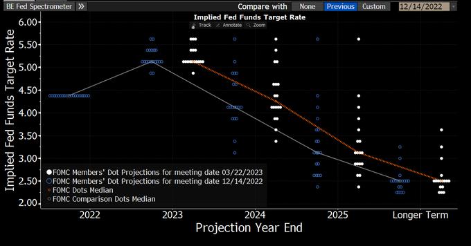与美联储决议声明同时发布的利率点阵图预测显示,美联储今年年底利率将来到 5.1%,与去年 12 月的上一次预测持平,这表明大多数官员预计未来只会再加息一次——在 18 位官员中有 10 人都支持这一观点。