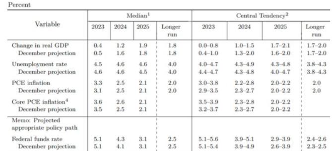 美联储将今年经济增长预期由 Q4 的 0.5% 下调至 0.4%,将明年经济增长预期由 1.6% 下调至 1.2%;将今年 PCE 同比预期由 12 月的 3.1% 上调至 3.3%,明年 PCE 同比预期保持 2.5% 不变;将今年失业率预期由 12 月的 4.6% 下调至 4.5%,明年失业率预期保持 4.6% 不变。