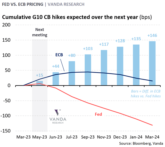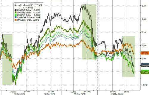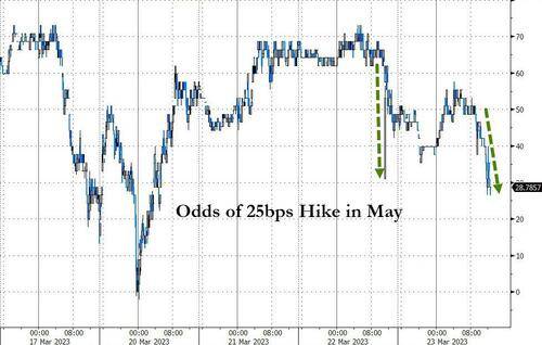 财联社3月24日讯(编辑 潇湘)华尔街交易员眼下正在关注,美国银行系统持续的动荡可能在多大程度上收紧信贷条件,损害美国经济,并迫使美联储改变策略转而降息。 周四,短期美债收益率进一步扩大了前一天的跌势。尽管此前一天,美联储的决策者们刚刚再度上调了利率,但他们试图用一种“善意”的方式加息,这可能是此次利率决议传达出的最重要的信息。 行情数据显示,与利率预期关联最为紧密的2年期美债收益率,隔夜下跌10.2个基点至3.835%,在短短不到两天时间内的跌幅已经达到了约30个基点。其他各期限美债收益率也多数走软:5年期美债收益率下跌7.7个基点报3.44%,10年期美债收益率下跌1.4个基点报3.426%。 ![]() 事实上,尽管周三议息日当天,美国股市一度因耶伦有关银行业的讲话,而忽视了美联储决议传递出的鸽派信号,但在周四,几乎全市场的投资者,都在对美联储将变得更为鸽派进行押注…… 美国三大股指隔夜普遍出现走高。标普500指数上涨11.75点,涨幅0.3%,至3,948.72点。道琼斯指数上涨75.14点,涨幅0.2%,至32,105.25点。纳斯达克综合指数上涨117.44点,涨幅1%,至11,787.40点。 在利率市场上,隔夜短期利率(STIR)预期的变动图表似乎正再度在华尔街“刷屏”——总体而言,市场对短期利率的定价下移在本周美联储决议后几乎彻底“放飞”: ![]() 这使得美联储的预期利率轨迹比欧洲央行明显更加鸽派: ![]() 美联储本周公布的最新3月利率点阵图预测曾显示,美联储今年年底利率将来到5.1%,与去年12月的上一次预测持平,但如今,利率市场的定价已经比这份点阵图预期低出了95个基点,这预示着整整多计算了近四次25个基点的降息。 ![]() 同时,美联储5月份下次会议加息25个基点的可能性,也已经降低至了26%。 ![]() 市场定价缘何一下子如此鸽派? 在市场对鲍威尔言论的反应中,金融条件收紧的重要性显而易见,债券定价似乎对美联储主席将银行业危机可能收紧信贷,从而将之与政策利率挂钩的说法,感到特别敏感。 美联储周三在会后声明中曾表示,“最近的银行业事态发展可能导致家庭和企业的信贷条件收紧,并对经济活动、就业招聘和通胀造成压力。” 加拿大皇家银行全球资产管理公司(RBC Global Asset Management)旗下BlueBay的高级投资组合经理Brandon Swensen指出,由于银行业发生的事情,信贷条件在利率定价上正在发挥更大的作用。鲍威尔在新闻发布会上提到,金融状况将变得更紧,问题之一是会收紧多少。 在利率决策会议之后的新闻发布会上,美联储主席鲍威尔已强调,美联储未来的加息幅度将不需要像硅谷银行倒闭前那么大了。他指出,硅谷银行倒闭后将出现的信贷状况收紧的影响可以被认为“是相当于一次加息,或许还不止一次”。 也正是鉴于预期中的信贷吃紧,美联储官员将其对今年美国经济增速的预期从去年12月时预测的0.5%下调至0.4%,将明年的增速预期从1.6%下调至1.2%。 Brandywine Global Investment Management投资组合经理Jack McIntyre表示,短期内,市场料将对那些更强劲的数据无动于衷,因为信贷紧缩还没有完全发生。再加上过去一年475个基点加息的“滞后影响”,今年晚些时候通胀应该会显著放缓。 事实上,美联储本周的加息本身就可能导致金融系统更加脆弱。虽然硅谷银行的情况比较特殊,但许多银行都有债券浮亏,并严重依赖不受存款保险保护的存款。这些存款已经在向太大而不能倒的银行或收益率更高的货币市场基金转移,本周的加息可能会导致这种趋势进一步加剧。此外,金融系统还可能潜伏着其他未引起注意的风险。 在2007年金融危机爆发的最初几周,时任美联储主席的伯南克下调了贴现率,但没有下调联邦基金利率,试图通过这种方式来保持金融稳定与货币政策职能的分离。但此后房贷危机不断恶化,仅数月之后,美联储就开始放松货币政策了。 虽然当前几乎没有理由认为现在的金融系统像当年那样脆弱,但美联储可能还是会发现,保持其两项职能的分离——维持金融系统稳定和调节宏观经济,一点儿也没有变得更加容易。 来源:财联社 |