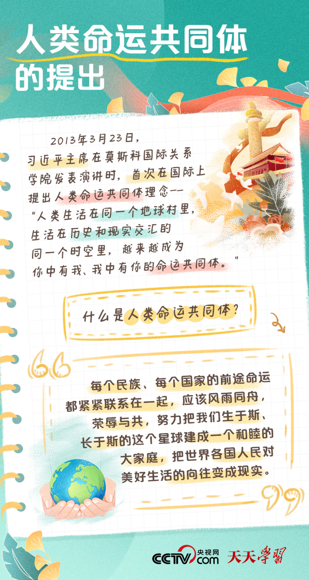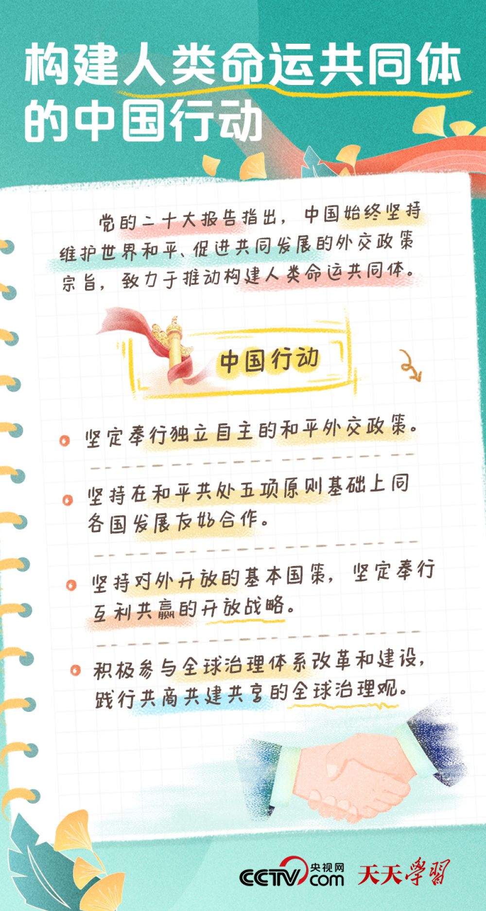 编者按:党的二十大报告深刻阐述了开辟马克思主义中国化时代化新境界、中国式现代化的中国特色和本质要求等重大问题,擘画了全面建成社会主义现代化强国的宏伟蓝图和实践路径。如何深入学习领会党的二十大报告的思想精髓与核心要义?央视网《天天学习》推出“二十大报告学习笔记”系列,为您“沉浸式”解读党的二十大报告关键词。 天天学习党的二十大报告指出,“构建人类命运共同体是世界各国人民前途所在”,并将“推动构建人类命运共同体”列为中国式现代化的本质要求之一。 10年前,习近平主席作为中国最高领导人首次出访期间,在俄罗斯提出构建人类命运共同体理念。该理念回应了各国人民求和平、谋发展、促合作的普遍诉求,给出了不同国家、不同民族、不同文明的共同奋斗方向,为中国特色大国外交提供了时代坐标。 ![]() ![]() ![]() ![]() ![]() ![]() ![]() ![]() |