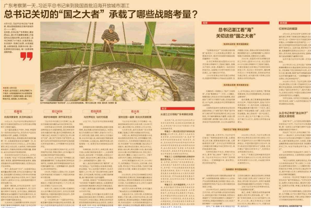![]() ![]() 位于徐闻县西连镇的“海洋牧场”,工人正在收获金鲳鱼。 南方日报记者 肖雄 通讯员 张锋锋 摄 ●时间:4月10日 ●地点:这次在湛江,总书记考察了4个地方,分别是国家863计划项目海水养殖种子工程南方基地、金牛岛红树林片区、徐闻港、大水桥水库。 4月10日,习近平总书记在广东考察,首站是我国首批沿海开放城市之一——湛江。 五年前,总书记赴广东考察时,要求把汕头、湛江作为重要发展极,打造现代化沿海经济带。这次在湛江,总书记考察了4个地方,从海洋渔业、生态保护,到港口运营、水资源配置,从耕海牧渔,到调丰补缺,每一处都事关民生福祉,每一处都承载战略考量。 看基地 向海洋要食物 关注种业振兴 10日上午,习近平总书记首站来到位于湛江市东海岛的国家863计划项目海水养殖种子工程南方基地。 这个基地是集水产饲料、种苗、养殖等为一体的综合研发平台。涉及的水产品类包括南美白对虾、金鲳鱼、石斑鱼等。 发展海洋渔业,既是建设海洋强国的重要一环,也是确保粮食安全的重要一环。在2017年的中央农村工作会议上,总书记提出要求,树立大农业观、大食物观,向耕地草原森林海洋、向植物动物微生物要热量、要蛋白,全方位多途径开发食物资源。 在去年的中央农村工作会议上,总书记进一步强调,“吃饭”不仅仅是消费粮食,肉蛋奶、果菜鱼、菌菇笋等样样都是美食。要推进陆基和深远海养殖渔场建设,拓宽农业生产空间领域。 种子,是农业的“芯片”,也是海洋渔业高质量发展的关键。总书记当天看的这个基地,是我国最大的南美白对虾亲本选育基地、全国现代渔业种业示范场,种子工程项目被列入国家863计划,也就是国家高技术研究发展计划。 值得一提的是,总书记在去年同一天开启海南考察,第一站也是看种子。在三亚市崖州湾种子实验室,总书记指出,要围绕保障粮食安全和重要农产品供给集中攻关,实现种业科技自立自强、种源自主可控,用中国种子保障中国粮食安全。 从去年到三亚看南繁科研育种,到这次到湛江看海水养殖育种,传递了总书记对种业振兴的殷殷关切。 保护珍稀植物 调节海洋生态 习近平总书记湛江之行的第二站,是位于麻章区湖光镇的金牛岛红树林片区。 红树林是生长在热带、亚热带海岸潮间带的胎生木本植物群落,因红树树皮中含有丰富的单宁酸,割开红树植物表皮,单宁氧化变红,树皮和刀口呈现红色,所以得名“红树”。湛江有“红树林之城”的称号。坐落于此的红树林国家级自然保护区是我国红树林面积最大、分布最集中的自然保护区。 总书记当天看的红树林片区,位于自然保护区东部。考察过程中,总书记重点关注加强红树林保护的相关情况。 2017年4月,总书记赴广西考察时,就曾踏着晚霞考察了北海金海湾红树林生态保护区。他强调,保护珍稀植物是保护生态环境的重要内容,一定要尊重科学、落实责任,把红树林保护好。 1992年,中国加入《湿地公约》。在全球红树林面积减少的趋势下,中国红树林面积不降反增。 2020年完成的第三次全国国土调查数据显示,中国红树林面积2.71万公顷,较2001年增加了近5000公顷。 去年11月,《湿地公约》第十四届缔约方大会开幕式在武汉举行。总书记在视频致辞时说,中国将推动国际交流合作,在深圳建立“国际红树林中心”。 从一片红树林,到一个国际合作平台,彰显着中国推动构建地球生命共同体、建设人与自然和谐共生的现代化的决心和担当。 看徐闻港 与世界相交 与时代相通 10日下午,习近平总书记来到徐闻港考察。 徐闻港地处琼州海峡黄金通道大陆端咽喉,是全球最大的客货滚装码头。年吞吐能力为车辆约320万辆次、旅客约1730万人次,实现水路、陆路、铁路、城市公交无缝对接。2020年开港以来,新航线直对海南省海口市新海港。从这里出发,粤琼两地海上航程缩短一半,能更好地对接海南自由贸易港。 舟楫相通,古已有之。徐闻古港,是汉代海上丝绸之路的始发港之一。从徐闻等地出发,来回全程一万多海里,沿途经过17个国家,是当时世界上最长的海上交通线之一。徐闻城因港而兴,盛极一时。 港口,是经济发展变化的“晴雨表”。总书记曾指出:“经济强国必定是海洋强国、航运强国。”在以往的国内考察中,他多次看港口。2017年,在广西北海市的铁山港考察时,总书记强调,写好海上丝绸之路新篇章,港口建设和港口经济很重要。 徐闻港,是推动广东海南相向发展、“双向奔赴”的重要交通枢纽,也是海南自由贸易港和粤港澳大湾区的关键连接点。一个港口,既牵系重大国家战略,也承载高水平对外开放。 在徐闻港,总书记重点关注提升交通基础设施互联互通水平的情况。去年底的中央经济工作会议提出,要通过政府投资和政策激励有效带动全社会投资,加强交通、能源、水利、农业、信息等基础设施建设,加强区域间基础设施联通。 看水库 坚持全国一盘棋 优化水资源配置 习近平总书记湛江之行的最后一站,是徐闻县城东边的大水桥水库,1958年7月竣工,最大坝高27米,总库容1.27亿立方米。 大水桥水库,是环北部湾广东水资源配置工程湛江引调水向南输水的终点站。 长期以来,粤西地区特别是雷州半岛是全国闻名的苦旱之地,自然调蓄能力弱,丰枯变化大,水资源短缺问题困扰当地人民。环北部湾广东水资源配置工程从西江干流取水,通过泵