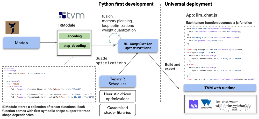 现在,只需一个浏览器,就能跑通“大力出奇迹”的大语言模型(LLM)了! 不仅如此,基于 LLM 的类 ChatGPT 也能引进来,而且还是不需要服务器支持、WebGPU 加速的那种。 例如这样: 这就是由陈天奇团队最新发布的项目 ——Web LLM。 短短数日,已经在 GitHub 上揽货 3.2K 颗星。 一切尽在浏览器,怎么搞?首先,你需要下载 Chrome Canary,也就是谷歌浏览器的金丝雀版本: 因为这个开发者版本的 Chrome 是支持 WebGPU 的,否则就会出现如下的错误提示: 在安装完毕后,团队建议用“终端”输入如下代码启动 Chrome Canary: /Applications/Google\ Chrome\ Canary./Contents/MacOS/Google\ Chrome\ Canary —enable-dawn-features=disable_robustness 启动之后,便可以来到官网的 demo 试玩处开始体验了。 不过在第一次展开对话的时候,系统还会出现一个初始化的过程(有点漫长,耐心等待)。 机器学习编译(MLC)是关键接下来,我们来看一看 Web LLM 如何做到“一切尽在浏览器”的。 根据团队介绍,其核心关键技术是机器学习编译(Machine Learning Compilation,MLC)。 整体方案是站在开源生态系统这个“巨人肩膀”上完成的,包括 Hugging Face、来自 LLaMA 和 Vicuna 的模型变体,以及 wasm 和 WebGPU 等。 并且主要流程是建立在 Apache TVM Unity 之上。 团队首先在 TVM 中 bake 了一个语言模型的 IRModule,以此来减少了计算量和内存使用。 TVM 的 IRModule 中的每个函数都可以被进一步转换并生成可运行的代码,这些代码可以被普遍部署在任何最小 TVM 运行时支持的环境中(JavaScript 就是其中之一)。 其次,TensorIR 是生成优化程序的关键技术,通过结合专家知识和自动调度程序快速转换 TensorIR 程序,来提供高效的解决方案。 除此之外,团队还用到了如下一些技术:
