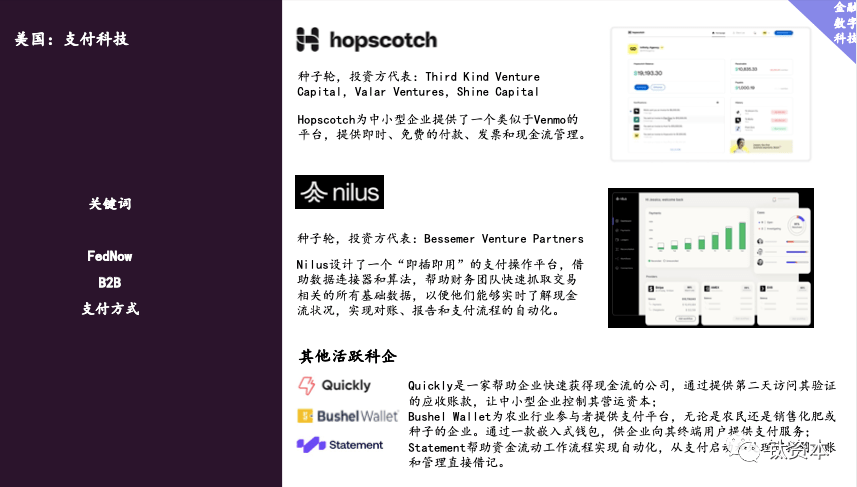 近期,金融科技暖风渐进,伴随金融机构常态化监管、注册制改革深化,相关金融IT基础设施也将迎来新一轮更新换代需求;国产化替代进程加速,金融新创直接受益。同时,财富管理的机遇也驱动着头部券商持续强化科技投入,智能投顾等创新产品逐渐推广,金融科技行业成长空间进一步打开。 目前,海外金融数字科技发展趋势如何?金融数字科技投资哪些方向值得关注?最近,钛资本邀请到Plug and Play China璞跃中国投资总监江子骞进行分享,以“金融数字科技海外趋势及投资机会分享”为主题。江子骞拥有上海财经大学MBA学位,是上海市创业指导专家志愿团成员。他先后任职大智慧、汇付创投,长期关注以数据和技术驱动的企业服务、金融科技企业,及半导体领域。投资案例包括法大大、金海通(603061)等,关于金融数字科技的未来发展走向有其专业的见解。本次分享主持人是钛资本钟晓昀,以下为分享实录: 重新定义金融科技 当下环境中,金融科技其定义也在不断更新。从狭义角度来看,金融科技不是一个非常热门、受到资本关注的领域,但从实际的金融机构IT投入来看,它还处在持续增长阶段,某种程度上,需要我们进一步厘清金融科技的定义,获得更清晰的理解,从而抓住投资机会。 海外金融数字科技发展趋势 海外web3.0大力发展,金融科技非常火热。在中国,线下移动支付和线上交易已习以为常,海外公司正在快速追赶,甚至在部分领域和模式有所超越和创新。 1、中国金融数字领域现状 回看中国金融数字领域,已看不到太多金融模式上的创新,更多是一些科技手段创新,尤其这几年中国金融机构面临着同质化竞争的状态。在相对存量的竞争里,如何获得差异化的优势? 一方面通过技术手段,这也是为什么金融机构对于当下的新兴技术领域会非常热衷,尤其以大模型为代表;另外一方面,他们认为这是一个打造差异化的竞争优势。例如,最近农行推出了国内银行业的第一个大模型应用ChatABC,产业也希望银行通过嵌入更多C端和B端的生活场景、消费场景,跟用户建立更深厚的绑定。 纵观全球,中国的金融科技发展是比较特殊的,目前已经告别了金融的创新,也非单纯的技术领域创新,更多是场景跟产业的融合,发展趋势上以切入到产业数字化领域为主导。但在海外,更多的还是围绕金融机构、金融模式上的创新。 2、海外金融数字创新方式 以一些创业公司为例,美国企业和机构都非常关注的创新方向:美国围绕B2B的支付手段衍生出非常多的创新模式,同时支付方式也不再局限于线上移动支付,类比中国的花呗,在海外就变成了先买后付的模式。在海外,没有大而全的集中式平台,也没有大而全的统一金融机构,所以企业会专注在自身领域上进行创新。 为帮助C端实现快速线上转账,以产品整体的交易量包括输入贡献为标准,目前来看可能是Paypal最大的一个增长潜力点。在B端支付的基础上,为帮助中小企业对自身现金支出及收入实现更好的对账,达到支付流程自动化,会更偏向于财务管理。这几家企业也是类似帮助企业在B2B的支付端能够更好的做一些服务,也可以有一些嵌入式的金融产品,很多的科技领域创新能够实现更好更快的支付模式的产生。在海外支付的费率也比较高,这些产业链公司能够获得较好的收益基础。 ![]() 欧洲市场更多会关注绿色金融应用,比如greenly,做了一个面向企业的碳排放管理平台,基于用户购买的产品,能够精准计算出碳排放量,而不是单纯地做碳排放的咨询。围绕碳排放和管理,国内这两年出现了很多创业公司,但更多是停留在咨询层面,很难帮企业真正做好绿色金融场景的实现需求。 在东南亚有很多新兴的数字银行,例如,Unoasia总部在新加坡,但是在菲律宾有其自身的数字银行牌照,目前也已成为菲律宾比较大的数字银行机构。在特定场景下帮助企业跟消费者实现金融模式的链接。如ideal是一家印尼的贷款服务商,可以帮助用户相对更便捷地获得抵押贷款的东西,这背后也看到了很多在中国的金融科技企业把相应的方法论移植到东南亚,相较而言有挺多机会可以给到中国的科技企业来做出海的动作。 在北美和欧洲,支付科技是相对热门的领域,受疫情影响,大家对于支付手段的线上化有更迫切的需求,海外其他TO B的线上支付化更加灵活,很多初创公司在B to B的支付模式上做了很多创新,帮助交易环节降低成本,减少欺诈以及财务管理、现金流管理等等。同时具有大量embedded finance嵌入式金融的机会,因为很多交易平台需要切入交易的环节,相应的科技公司搭建平台和金融机构之间的链接,近几年海外涌现了不少创新和投资领域。 在非洲,围绕数字银行的新兴金融领域是一个非常迅速的增长点,因为当地的基础设施相对落后,数字银行便成为他们快速追赶、实现金融数字化的手段。回溯亚洲、东南亚市场,不但在复制中国的发展模式,包括移动支付、B2B,并且一些中国金融科技公司,也在当地做投资和业务拓展,提高发展速度。 海外更多聚焦在支付方式的升级上,不局限于与国内类似的线上移动支付领域。海外支付的主体,尤其在B端和B端之间以及支付方式上的创新,类似先买后付的形式,某种程度上一些金融模式的创新已有流行趋势,不是单纯模仿中国的道路,而是打通自身的创新领域。另外海外突出的绿色金融板块有很多值得借鉴的地方。 金融数字科技投资方向