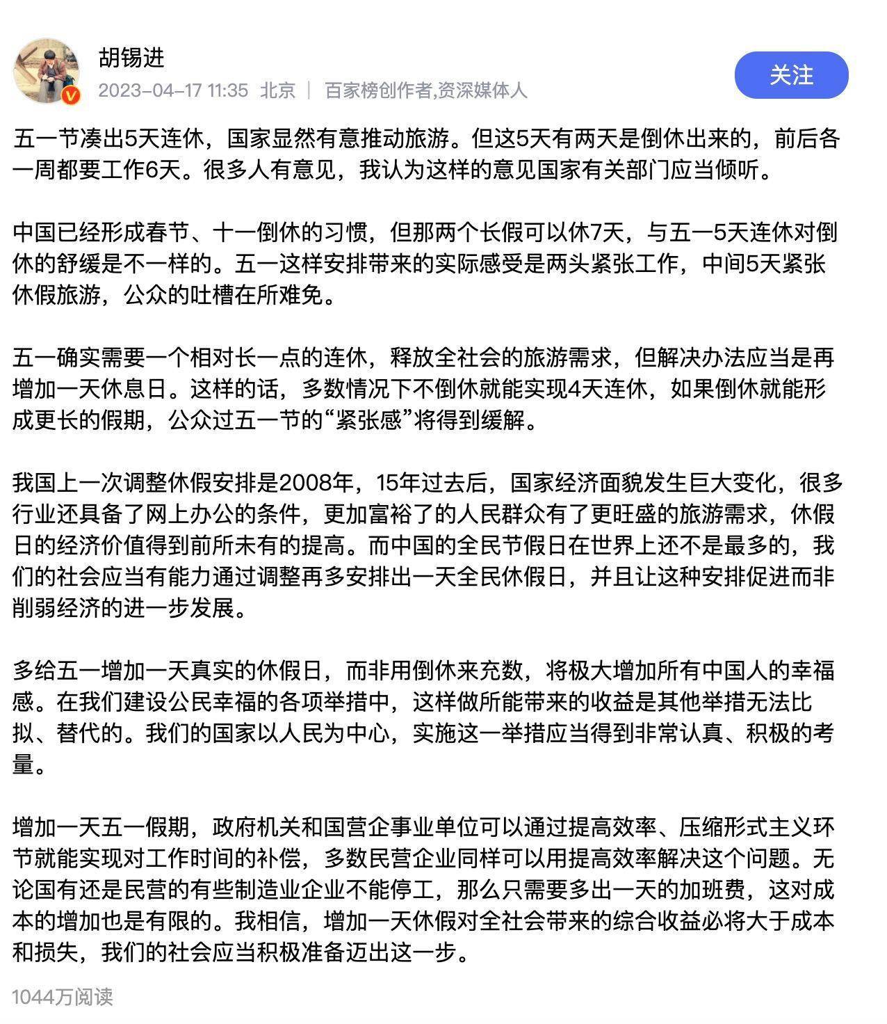 金融界4月17日消息,胡锡进在社交媒体发文称,五一确实需要一个相对长一点的连休,释放全社会的旅游需求,但解决办法应当是再增加一天休息日。 “多给五一增加一天真实的休假日,而非用倒休来充数,将极大增加所有中国人的幸福感。”胡锡进表示,在我们建设公民幸福的各项举措中,这样做所能带来的收益是其他举措无法比拟、替代的。 胡锡进表示,我国上一次调整休假安排是2008年,15年过去后,国家经济面貌发生巨大变化,很多行业还具备了网上办公的条件,更加富裕了的人民群众有了更旺盛的旅游需求,休假日的经济价值得到前所未有的提高。 ![]() 来源:金融界 |