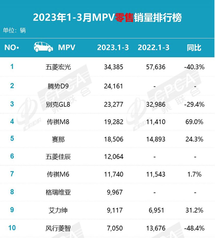 腾势 D9 在比亚迪技术的加持下,销量成绩一路攀升。根据乘联会的数据今年第一季度腾势 D9 累计销量为 24161 辆,成功超越别克 GL8、丰田赛那、本田奥德赛等合资 MPV,成为 MPV 销量榜第二位,排在五菱宏光之下。