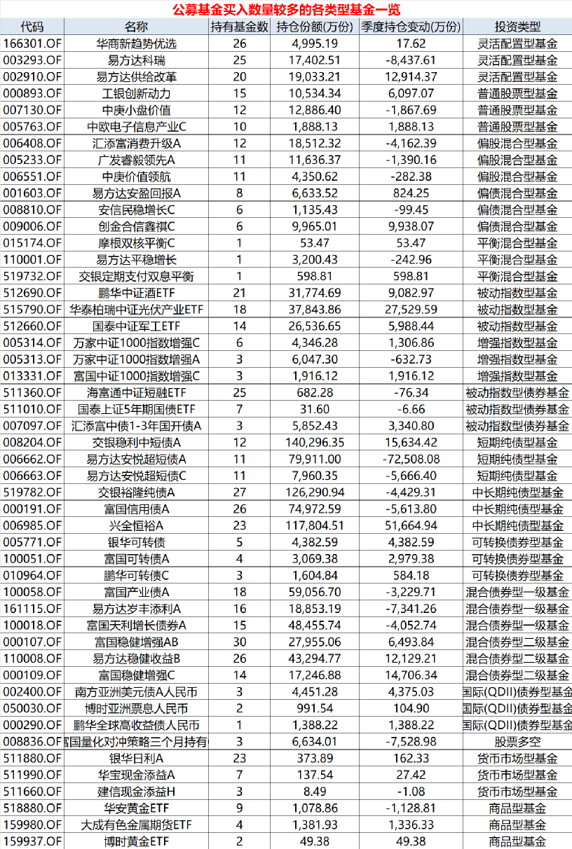 中国基金报记者 天心 随着一季报披露完毕,有着“专业买手”之称的公募FOF最新持仓随之出炉。 Wind数据统计显示,华商新趋势优选、易方达科瑞、易方达供给改革三只基金是全市场公募FOF一季度持有只数最多的权益基金,相比去年四季度,易方达供给改革取代融通健康产业,新进FOF“最爱”权益基金前三名。 从调仓变动上看,部分公募FOF继续超配权益资产,并偏向成长风格基金,有的对阶段性涨幅过快的行业做了减仓,增加了部分业绩和估值匹配合理的行业。 谈及后市,多位FOF基金经理认为,中期维持对权益资产的乐观,国内宏观经济处于底部向上修复的状态,且市场估值压力仍较小,战略上将推动 A 股的上涨。结构上主要关注以下条潜在盈利主线:TMT、复苏(消费、投资)以及美债利率定价资产估值修复等。 华商新趋势优选、易方达科瑞、易方达供给改革 最受公募FOF青睐 随着公募基金旗下一季报披露,FOF基金经理新一季的基金配置清单也重磅出炉。 具体来看,平安盈禧均衡配置1年持有、平安养老2035、富国智优精选3个月持有等基金在一季度均重点配置华商新趋势优选基金,其中更有包括平安盈禧均衡配置1年持有、平安养老2035、富国智优精选3个月持有、嘉实养老2050五年、嘉实养老2040五年等基金将华商新趋势优选作为前三大重仓基金。 不过,从持仓数量上看,一季度末公募FOF合计持有华商新趋势优选基金份额4995.19万份,相比去年末增持了17.62万份,持有华商新趋势优选的FOF基金数量则相比去年末增加了5只。 据相关资料介绍,华商新趋势优选基金成立于2015年5月14日,基金经理周海栋过往长期以成长风格著称,截止今年一季度末,成立以来收益率达到355.53%,过去五年收益308.35%,业绩排名同类基金第一。 Wind数据显示,共有25只公募FOF三季度重仓持有易方达科瑞,合计持有份额1.74亿份,相比去年末持有的FOF基金只数增加了6只,环比减持8437.61万份。据悉,易方达科瑞基金经理杨嘉文擅长逆势投资,关注估值被错杀的个股,对于基本面坚固或出现好转信号的公司敢于重仓买入。 易方达供给改革在一季度新进公募FOF买入只数榜前三。Wind数据显示,共有20只公募FOF三季度重仓持有易方达供给改革,合计持有份额1.90亿份,相比去年底持有的FOF基金只数增加了13只,环比增持了1.29亿份。据悉,易方达供给改革基金经理杨宗昌是化学博士,有过多年化工研究经验,他坚持在熟悉的行业内把握投资机会,并通过努力不断扩大能力圈,目前行业配置更趋均衡。 从增持榜单来看,据Wind数据统计,被动指数基金增持前三“花落华泰柏瑞中证光伏产业ETF、广发中证全指信息技术ETF、华夏恒生科技ETF;灵活配置混合基金中,汇添富科技创新、易方达供给改革、易方达新兴成长位列增持份额前三;偏股混合基金增持前三则被易方达信息产业、财通资管健康产业、中欧碳中和占据;股票基金增持前三分别为中欧信息产业、汇添富外延增长主题、华夏智胜先锋;平衡基金增持前三则是交银定期支付双息平衡、摩根双核平衡、易方达平稳增长;偏债混合基金增持前三依次为易方达安盈回报、安信民稳增长、创金合信鑫祺。 ![]() 权益仓位偏向成长风格 减持涨幅过高行业配置比例 一季度A股市场整体表现相对较好,但行业分化较大。受益于数字经济政策的提振与人工智能主题的不断发酵,科技板块涨幅较大;而地产和新能源等板块表现较弱。从一季度披露的情况上看,部分FOF基金经理继续超配权益仓位,并向成长风格偏移,也有部分FOF基金经理在一季度末对涨幅过高行业基金进行了减仓, 增加了部分业绩和估值匹配合理的行业。 长期业绩领先的兴全安泰平衡养老FOF基金经理林国怀在一季报中表示,本季度基金主要进行以下操作:1、持续维持权益资产的仓位略高于权益配置中枢;2、逐步提升组合中成长型基金的配置比例,同时适度降低价值型基金的配置比例;3、逢高减持部分转债品种,增加其他确定性较高的绝对收益或相对收益基金品种;4、继续根据既定的策略参与股票定增、大宗交易等投资机会,减持解禁的股票。 组合风格上,目前权益部分依然保持略超配价值风格,但偏离幅度已显著下降,保持一贯的“略偏左侧”和“适度均衡”的配置策略,通过积极挖掘市场上相对收益和绝对收益的投资机会不断增厚组合收益,通过“多资产、多策略”的方式来平滑组合波动,努力将该基金呈现为“相对稳定的‘贝塔’和相对确定的‘阿尔法’特征”。 从一季度持仓上看,富国城镇发展、博时标普500ETF新进兴全安泰前十大重仓基金,富国信用债、万家安弘淡出前十大之列。 ![]() “在年初的时候,基金经理对全年市场的主线判断不是很清晰,因此组合整体上除了向小市值成长风格有一定偏离外,其他方面没有明显的偏离,整体上比较均衡。随着近期政策方向的明朗,基金经理对今年全年股票市场的主要方向逐渐有了较明确的判断,在操作上,本基金在 1 季度,逐渐增加了低估值价值风格基金和股票,以及与数字经济相关的基金和股票,未来计划视相关板块的估值水平变化做动态调整。”华夏养老2045三年基金经理许利明表示。 中欧预见养老2035三年今年一季度的主要持仓仍然坚持长期资产配置策略,但继续对部分主动权益基金进行了分散和优化,在一季度股票市场整体小幅上涨但行业之间分化巨大的市场中,基于对长期基本