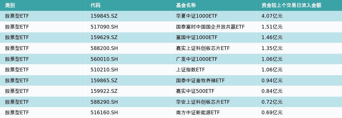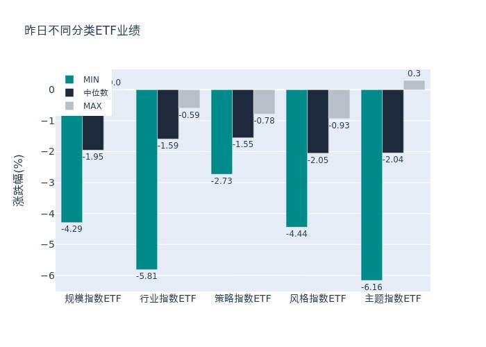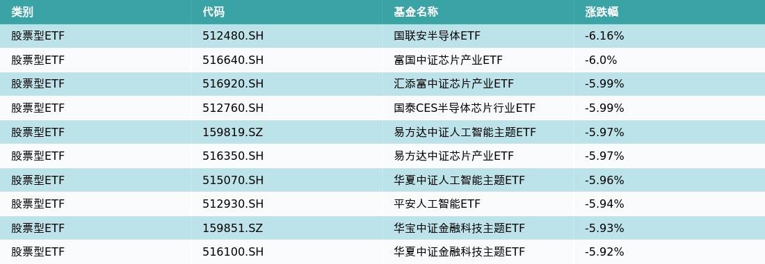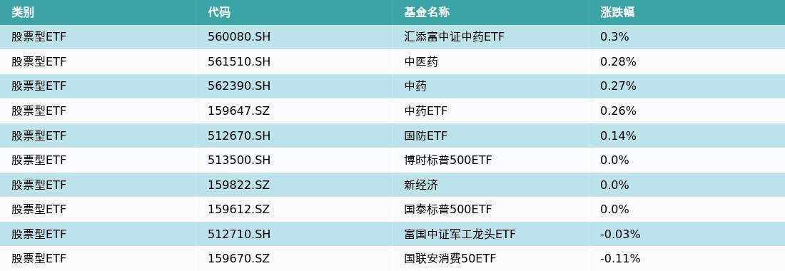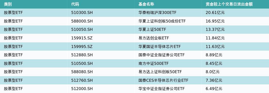一、证券市场回顾 同花顺数据显示,4月21日,上证综指日内下跌1.95%,收于3301.26点,最高3367.61点;深证成指日内下跌2.28%,收于11450.43点,最高11751.41点;创业板指日内下跌1.91%,收于2341.19点,最高2400.79点。北向资金由上个交易日的流入46.91亿元转变成流出76.19亿元。 二、ETF市场表现1、股票型ETF整体市场表现 4月21日股票型ETF收益率中位数为-1.94%。其中按照不同分类,规模指数中博时标普500ETF收益率最高,为0.0%;行业指数中油气ETF收益率最高,为-0.59%;策略指数中华泰柏瑞上证红利ETF收益率最高,为-0.78%;风格指数中嘉实医药健康100ETF收益率最高,为-0.93%;主题指数中汇添富中证中药ETF收益率最高,为0.3%。 ![]() 2、股票型ETF涨跌幅排行 4月21日股票型ETF涨幅最高的3支ETF及其收益率分别为:汇添富中证中药ETF(0.3%)、中医药(0.28%)、中药(0.27%)。涨幅前10详情见下表: ![]() 4月21日股票型ETF跌幅最大的3支ETF及其收益率分别为:国联安半导体ETF(-6.16%)、富国中证芯片产业ETF(-6.0%)、汇添富中证芯片产业ETF(-5.99%)。跌幅前10详情见下表: ![]() 3、股票型ETF资金流向 4月21日股票型ETF资金流入最多的3支ETF及其流入金额分别为:华夏中证1000ETF(流入4.07亿元)、国泰富时中国国企开放共赢ETF(流入1.51亿元)、富国中证1000ETF(流入1.46亿元)。资金流入前10详情见下表: ![]() 4月21日股票型ETF资金流出最多的3支ETF及其流入金额分别为:华泰柏瑞沪深300ETF(流出20.61亿元)、华夏上证科创板50成份ETF(流出16.95亿元)、华夏上证50ETF(流出13.37亿元)。资金流出前10详情见下表: ![]() 三、机构观点