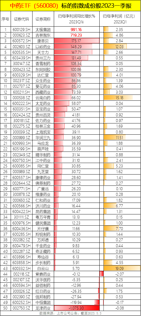 五一节后A股首个交易日,中药板块早盘再度逆市拉升,同仁堂、华润三九一度涨超6%,达仁堂涨停,太极集团、吉林敖东、九芝堂、天士力、昆药集团涨超2%,云南白药、广誉远、白云山、片仔癀、以岭药业等均不同程度上涨。 消息面,4月28日盘后,同仁堂公布一季度业绩,实现营业收入51.43亿元,同比增长30.08%;归属于上市公司股东的净利润5.23亿元,同比增长30.85%。 ETF方面,中药ETF(560080)早盘涨超3%,盘中价创上市以来新高,开盘30分钟振幅超3.7%,成交额已超2900万元。 ![]() A股中药板块成份股今年一季报已全部披露,以中证中药指数50只成份股为例,其中43只净利润同比正增长,更有9只净利润增速超100%,指向中药板块整体景气回升: 太极集团狂揽991%的净利润增幅; 吉林敖东净利润高增719%; 康恩贝归母净利润同比大增175%; 以岭药业归母净利润同比增长148%; 天士力归母净利润同比增长147%; 东阿阿胶、达仁堂、香雪制药等归母净利润同比增长均超100%; 其他成份股方面,云南白药一季度实现净利润15.18亿元,同比增长66.01%,广誉远一季度营业收入3.69亿元,同比增长55.16%,归母净利润979.05万元,同比增长26.20%;西藏药业2023年一季度预计归母净利润同比增长73.43%,亚宝药业净利润同比增长50.47%,佐力药业同比增长41.76%,江中药业、上海凯宝、葫芦娃等净利润同比增超30%,康缘药业、济川药业、健民集团、片仔癀净利润同比增幅在10%-30%之间。 ![]() 数据来源:上市公司年报 浙商证券表示,展望2023Q2及后半年,我们预计国内医药诊疗复苏、投融资逐渐恢复,我们持续看好受益于营运效率提升的中药板块、临床数据催化的创新药等。中药仍是今年医药投资胜负手,投资机会贯穿全年;创新药从β到α,配套产业链(CXO、科研工具)也具备配置价值。 兴业证券最新观点表示,中药板块有望演绎估值扩张逻辑。我们认为从2023年策略上来看,中药将演绎三个阶段的交易机会——业绩稳定、估值修复、估值扩张。以中国特色估值体系为切入点,其在医药行业演绎路径之一便是中医药:近期相关部门发布《中医药振兴发展重大工程实施方案》,进一步从政策制度体系强化对于中医药行业发展的支持,传承创新发展中医药是新时代中国特色社会主义事业的重要内容,是中华民族伟大复兴的大事。中药板块有望进入估值扩张阶段。整体看好中药板块机会,业绩趋势向好,估值有望从修复到扩张。 看好中药板块,不妨关注中药ETF(560080)。公开资料显示,中药ETF(560080)跟踪复制中证中药指数,是全市场规模领先中药ETF,聚焦中药生产和销售等相关领域,指数成份股囊括片仔癀、云南白药、同仁堂等国内知名中药领域优质龙头,前十大重仓股占比超50%。(数据来源:中证指数公司,截至2023.4.26,指数成份股不代表个股推荐) 【中药ETF(560080)标的指数前十大重仓股】 ![]() 注:指数成份股不代表个股推荐 风险提示:基金有风险,投资需谨慎。投资人应当阅读《基金合同》《招募说明书》《产品资料概要》等法律文件,了解基金的风险收益特征,特别是特有风险,并根据自身投资目的、投资经验、资产状况等判断是否和自身风险承受能力相适应。基金管理人承诺以诚实信用、谨慎尽责的原则管理和运用基金资产,但不保证基金一定盈利或本金不受损失。中药ETF(560080)属于中等风险等级(R3)产品,适合经客户风险等级测评后结果为平衡型(C3)及以上的投资者。标的指数并不能完全代表整个股票市场。标的指数成份股的平均回报率与整个股票市场的平均回报率可能存在偏离。请投资者关注指数化投资的风险以及集中投资于中证中药指数成分股的持有风险,请关注部分指数成分股权重较大、集中度较高的风险,请关注指数化投资的风险、ETF运作风险、投资特定品种的特有风险、参与转融通证券出借业务的风险等。文中提及个股仅为指数成份股客观展示列举,本文出现信息只作为参考,投资人须对任何自主决定的投资行为负责。本文中的任何观点、分析及预测不构成对阅读者任何形式的投资建议。 风险提示:界面有连云呈现的所有信息仅作为参考,不构成投资建议,一切投资操作信息不能作为投资依据。投资有风险,入市需谨慎! |