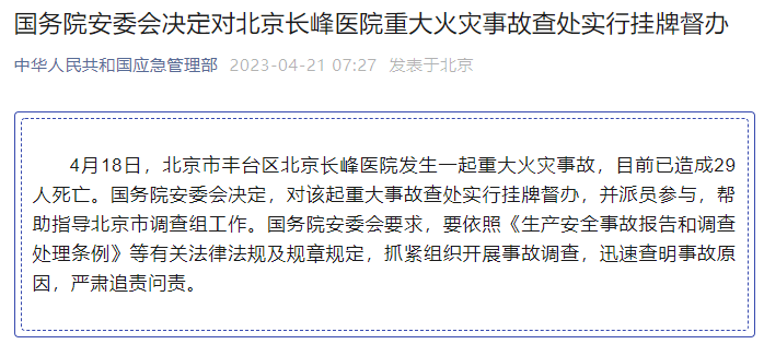 4月18日,北京市丰台区北京长峰医院发生一起重大火灾事故,目前已造成29人死亡。国务院安委会决定,对该起重大事故查处实行挂牌督办,并派员参与,帮助指导北京市调查组工作。国务院安委会要求,要依照《生产安全事故报告和调查处理条例》等有关法律法规及规章规定,抓紧组织开展事故调查,迅速查明事故原因,严肃追责问责。 ![]() (原标题:国务院安委会决定对北京长峰医院重大火灾事故查处实行挂牌督办) 来源:中华人民共和国应急管理部 流程编辑:tf027 |