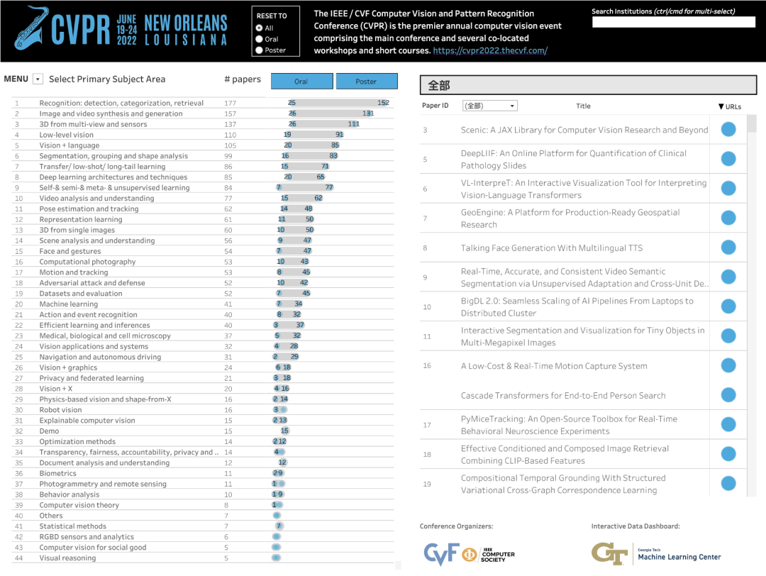 计算机视觉三大顶会之一CVPR2023接收结果已经公布,一共有2360篇论文被接收。  近年来,CVPR的论文投稿量持续增加,从 CVPR2019 的5160篇有效投稿增长到CVPR2020 年6656篇,到 CVPR2021 的7500篇,再到 CVPR2022 的8161篇。而今年又再创新高,达到了9155篇,比CVPR2022增加了12%,几乎每年都保持了10%以上的增幅。而今年有2360篇,接收率为25.78%。 今年的CVPR将在加拿大举行。今年采用单轨会议的形式,并取消了传统Oral的评选。  74435 在等待 CVPRR2023 为我们带来的新技术之时,我们先对去年的 CVPR2022 进行简要的回顾。 2022 年 CVPR 共计接收了2067篇论文,官方统计了各个研究方向论文的Oral数量和Poster数量,从中可以看出计算机视觉学术研究发展的一些趋势。其中,检测类以177篇成为 CVPR2022 最热门的方向,其次为图像视频生成(157篇)、三维视觉(137篇)、底层视觉(110篇)、视觉+语言(105篇)。