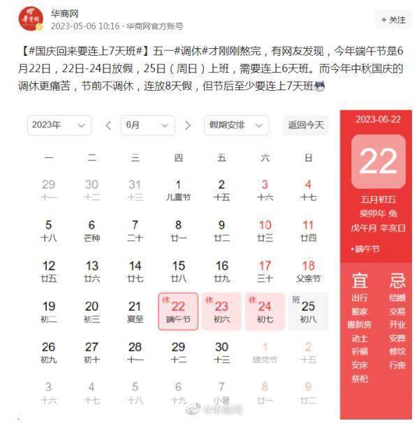 五一#调休#才刚刚熬完, 有网友发现, 本年端午节是6月22日, 22日-24日放假,25日(周日)上班, 必要连上6天班。 而本年中秋国庆的调休更…… 节前不调休,连放8天假, 但节后至少要连上7天班 ![]() 端午节、中秋节 和国庆节放假调休日期的 详细安排关照如下。 端午节放假3天 本年端午节 6月22日至24日放假调休 休假共3天,上班6天 6月25日(星期日)上班 ![]() 中秋、国庆放假8天 本年中秋国庆假期“合体”,形成8天的超等黄金周,但节后必要连上7天班。9月29日至10月6日放假调休,共8天。10月7日(星期六)、10月8日(星期日)上班。 ![]() ![]() 开心吗? 转自:华商网 泉源:深圳消息网 |