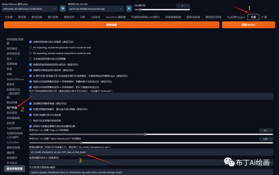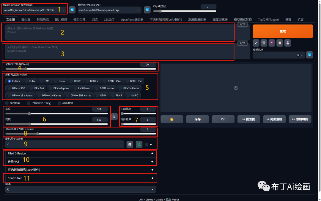 ![]() (点击可放大图片) 我们按图上的数字编号依次给大家介绍一下 1、Stable Diffusion模型 这里是我们用来切换CheckPoint模型(cpt文件)的地方,就是我们通常说的切换大模型的地方,点开这里会看到你的Stable Diffusion(下文简称SD)已安装了哪些大模型,可以选择进行切换。 ![]() 这些模型具体放在你的安装包的这个路径下面: D:\novelai-webui-aki-v3\models\Stable-diffusion(如果你下载的也是秋叶大佬的整合包,前面的novelai-webui-aki-v3文件名应该是一样的)补充:此处除了切换模型,还可以自己添加其他选项,比切换vae,CLIP skip等等,就是这里的参数: ![]() 打开设置-用户界面-快捷设置列表/Quicksettings list,添加参数就可。这个参数可以自己去config.json找。 ![]() 2、正向提示词(Prompt)顾名思义,这里就是通过输入文字,SD生成图片的地方。其中数字2代表的区域是正向提示词,表示你希望图片中看到的元素;例如想在图片中画一只小猫咪,输入:1cat,然后点击右侧的“生成”按钮, ![]() 然后你就会得到一张小猫咪的图片了。 ![]() 3、反向提示词(Negative Prompt)数字3代表的区域是反向提示词(也叫负面提示词),表示你不希望图片中出现的元素;SD在绘画的过程中会存在很多不确定性,因此我们需要通过这些负面提示词来过滤掉一些我们不想要的内容,使我们的图片达到更加满意的效果,例如:我们看到上面的猫咪是在室内,如果你想它在室外,除了通过给正面提示词添加:outdoors以外,你还可以给负面提示词添加:indoors ![]() 这样我们得到的图片,就会是在室外了。 ![]() 随着你对SD了解的深入,这里通常是放一些图片质量修饰词了。 例如:low quality,worst quality。通过这些修饰词一方面提高画质效果,另一方面就是上面讲到的规避不想看到的元素,特别是当你在画人的时候,总会出现一些意想不到的元素,那么就可以在这里进行规避。 有关提示词的语法,我将在后面再具体给大家讲解介绍。 4、采样迭代步数(Steps)生成图片的迭代步数,每多一次迭代就会让 SD更接近我们的提示词。更高的步数需要花费更多的计算时间,步数越大,图像细节越多,默认是20步,如果你的显卡和CPU比较给力,数值可以往上调。5、采样方法(Sampler) 就是SD进行绘画所使用的算法,常用的算法有三种,分别是Euler a,DPM++2S a Karras和DDI ![]() 5.1、Euler a1)、Euler a是一种用于控制时间步长大小的可调参数,在Stable Diffusion中采用Euler时间步长采样方法。适当的Euler a值能够捕捉到细节和纹理,但如果值太大会导致过度拟合,生成图像出现噪点等不良效果。2)、一句话概括:采样生成速度最快,但是如果说在高细节图增加采样步数时,会产生不可控突变(如人物脸扭曲,细节扭曲等)。3)、适合:ICON,二次元图像,小场景。5.2、DPM++2S a Karras 1)、采用 DPM++2S a Karras 采样方法生成高质量图像,该方法在每个时间步长中执行多次操作,同等分辨率下细节会更多,比如可以在小尺寸里绘画全身像,代价是采样速度更慢。2)、适合:写实人像,复杂场景刻画。5.3、DDIM 1)、DDIM 采样方法可以快速生成高质量的图像,相比其他采样方法具有更高的效率,想尝试超高步数时可以使用,随着步数增加可以叠加细节。2)、适合:写实人像,复杂场景刻画。当然大家也可以逐个尝试一下。6、图片分辨率 这里是设置图片分辨率的地方,长宽的单位都是像素。通常如果你的显卡是入门级的,建议用默认的512*512的分辨率即可,如果你的显卡比较给力,可以提高分辨率,当前SD版本(SD v1.5)最高支持2048*2048的分辨率。7、生成批次和每批数量(Batch&Num) 这里就是每次点击“生成”按钮时会根据你这里的设置输出多少张图片,图片的数量=生成批次*每批数量当然生成的图片张数越多所消耗的时间越长,特别是显卡不怎么给力的就会更长。 8、提示词相关性(CFG Scale) 图像与你的提示的匹配程度,增加这个值将导致图像更接近你的提示,但它也在一定程度上降低了图像质量,过高的 CFG Scale 体现为粗犷的线条和过锐化的图像,这个值一般设置为 7~11。9、随机种子(Seed)这里是图片在生成时的所有随机性,它初始化了 Diffusion 算法起点的初始值。如果你想每次得到的都不一样,那么使用-1即可,如果你觉得某张图片的不错,可以通过生成的图片,查看它的随机种子值来指定。例如:我们刚才生成室外的猫咪,在底部就会告诉你它对应的随机种子值是多少 ![]() 10、插件 这里通常会显示我们常用的一些插件,SD是一款开源的AI绘画工具,拥有大量优质的插件,例如C站助手,OpenPose编辑器,MultiDiffusion等插件都很好用,能帮助大家解决一些特定的问题,这个我在后续的教程里也会给大家一一讲解。11、ControlNet它其实也是一个插件,但是这个插件的功能非常强大,特别是在绘画人物时,通过与OpenPose编辑器一起使用可以指定人物动作,给大家看下ControlNet官网的相关示例 ![]() 其中Source层是我们提供的原始图片,ControlNet通过不同模型预处理成Input的相关内容,再结合我们的大模型和提示词就可以得到Output的相关内容了。 这里只是先简单给大家介绍一下,因为ControlNet涉及的内容实在是太多,可玩性也非常高,我们后续再通过多个篇幅讲解。以上就是今天的全部内容了,觉得不错记得帮忙一键三连(转发+点赞+在看),谢谢大家 ![]() |