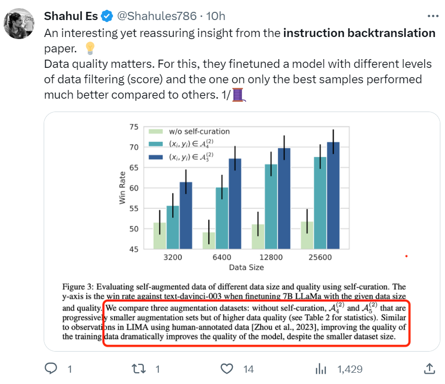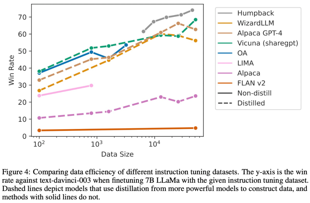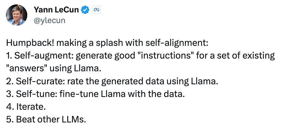 ![]() 夕小瑶科技说 分享 来源 | 机器之心 作者 | 小舟、陈萍这一年来,以 ChatGPT 和 GPT-4 为代表的大语言模型(LLM)发展迅速,紧随其后,Meta 开源的 LLaMa、Llama 2 系列模型在 AI 界也引起的了不小的轰动。但随之而来的是争议不断,有人认为 LLM 存在一些不可控的风险,给人类生存构成一些潜在威胁。为了应对这些挑战,对 LLM 对齐的研究变得越来越重要,有研究者提出指令跟随(instruction following),但这种方法需要大量的人工注释。然而,注释如此高质量的指令跟随数据集耗费巨大。本文来自 Meta AI 的研究者提出了一种可扩展的方法即指令回译(instruction backtranslation),该方法通过自动注释相应的指令来构建高质量的指令跟随语言模型。 ![]() 论文地址: https://arxiv.org/pdf/2308.06259.pdf具体而言,该研究从一个语言模型开始,并作为种子模型,该模型在少量的种子数据以及 web 语料库上进行了微调。种子模型的作用是用来构建训练样本,然后这些样本中的一些高质量样本将会被筛选出来,接着,这些数据被用来微调一个更强大的模型。经过两轮迭代的数据集对 LLaMa 进行微调,所产生的模型 Humpback 在 Alpaca 排行榜上优于其他现有的非蒸馏模型,如 LIMA、Claude、Guanaco 等。Humpback 原意为座头鲸,又名驼背鲸,Meta 将模型命名为 Humpback,也别有深意吧。 ![]() 之所以称为指令回译,研究者表示这借鉴了机器翻译中经典的反向翻译方法,其中人类编写的目标句子会自动用模型生成的另一种语言的源句子进行注释。图灵奖得主 Yann LeCun 高度概括了这项研究的方法,并称赞 Meta 这项工作为对齐研究做出重要贡献: ![]() 还有网友对这项研究进行了很好的概括:数据质量对大模型来说确实很重要,研究过程中,他们使用不同级别的过滤数据,微调了一个模型,结果表明,只有最好的样本才能得出比其他样本表现更好的模型。该论文提出了一种需要两个步骤完成的新的数据增强范式。首先,必须拥有一组种子(指令、输出)对和语料库才能生成更多好的指令数据。 ![]() 下图比较了 Humpback 与一些开源模型和专有模型。 ![]() 下表 4 表明,本文方法在 65B 和 33B 模型尺度上都是非蒸馏模型中表现最好的模型。 ![]() 下面我们看看具体方法。方法简介该研究提出了一种自训练方法(self-training),该方法通常假定可以访问基本语言模型、少量种子数据和未标记的样本集(例如网络语料库)。未标记数据往往是一大堆形态各异的文档,由人类编写,其中包括人类感兴趣的各种话题内容,但最重要的是没有与指令进行配对。这里还有两个关键的假设,第一个假设是这个非常大的文本集(未标记样本集)存在一些子集,适合作为某些用户指令的生成样本。第二个假设是可以预测这些候选答案的指令,这些指令可以用于形成高质量样本对,以训练指令遵循模型。如下图 1 所示,该研究提出指令回译过程包含两个核心步骤:自增强:为未标记的数据(即网络语料库)生成指令,以为指令调优产生训练数据对(指令 - 输出)。自管理:自主选择高质量样本数据作为训练数据,以微调基础模型来遵循指令,这种方法是迭代完成的。 ![]() 其中,自管理步骤采用的 prompt 如下表 1 所示: ![]() 实验及结果本文的数据集主要包括种子数据和增强数据,具体信息如表 2 和图 2 所示: ![]() ![]() 图 3 表示尽管扩大了数据规模,但没有自我管理(self-curation)的增强数据用来训练模型并不能提高指令跟随性能。 ![]() 下图比较了不同指令调优数据集的数据效率。 ![]() 数据和模型的联合扩展:该研究发现在 7B 模型中观察到的数据扩展趋势同样也适用于更大的模型。例如对 65B 的种子模型增加高质量的增强数据会带来进一步的改进。 ![]() 常识推理:该研究在五个常识推理基准上进行了测试,SIQA 、PIQA、Arc-Easy、Arc-Challenge 和 Openbook QA (OBQA) , 结果总结于表 5 中。结果表明,与基础模型相比,本文模型在社会推理等多个方面的表现有所提高。 ![]() MMLU:表 6 总结了不同模型在 MMLU(massive multitask language understanding)的结果。与基础模型相比,本文微调模型提高了零样本准确率,但在 5 个样本上下文示例中表现不佳。 ![]() ![]() |