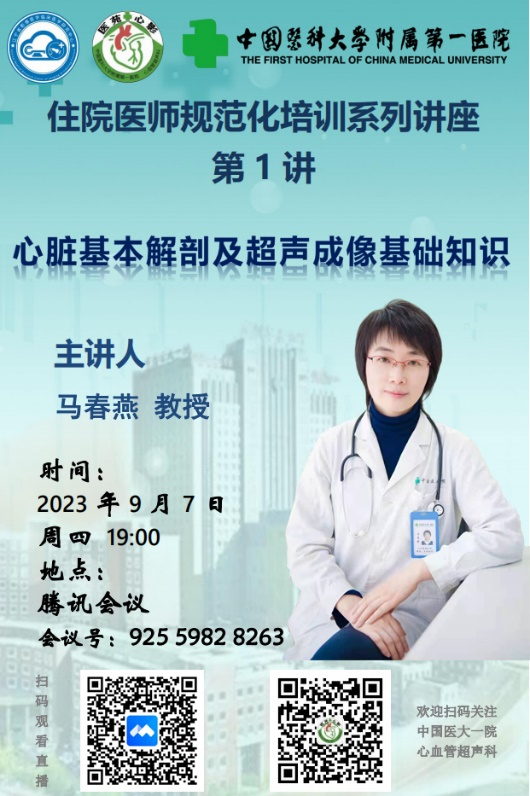 ![]() 中国医大一院心血管超声科住培系列讲座重 磅 回 归! ![]() ![]() 开课啦!!! ![]() 中国医大一院心血管超声科推出的“住院医师规范化培训系列讲座”于2023年9月7日起重磅回归,本轮讲座在紧扣住院医师规范化培训教学大纲的前提下,对课程进一步更新升级、丰富完善,课程安排更加系统,循序渐进,旨在提高住院医师规范化培训学员对心血管超声相关专业知识的了解,加强超声科医生的临床规范化诊断水平。 第一讲强势归来 第一讲:心脏基本解剖及超声成像基础知识 马春燕 ![]() 课程题目:心脏基本解剖及超声成像基础知识课程讲者:马春燕教授 博士生导师 心血管超声科主任课程简介:介绍超声心动图常用技术及应用,心脏各标准切面及观察内容,为掌握各疾病的超声诊断打好基础。课程时间:2023年9月7日 周四 19:00课程地点:腾讯会议 (会议号:925-5982-8263)观看方式:1、手机扫描上方海报二维码进入直播间观看2、下载腾讯会议app扫码或输入会议号观看3、复制搜索链接进入直播间观看https://meeting.tencent.com/dm/lC5z9gRNNoxU ![]() ![]() |
